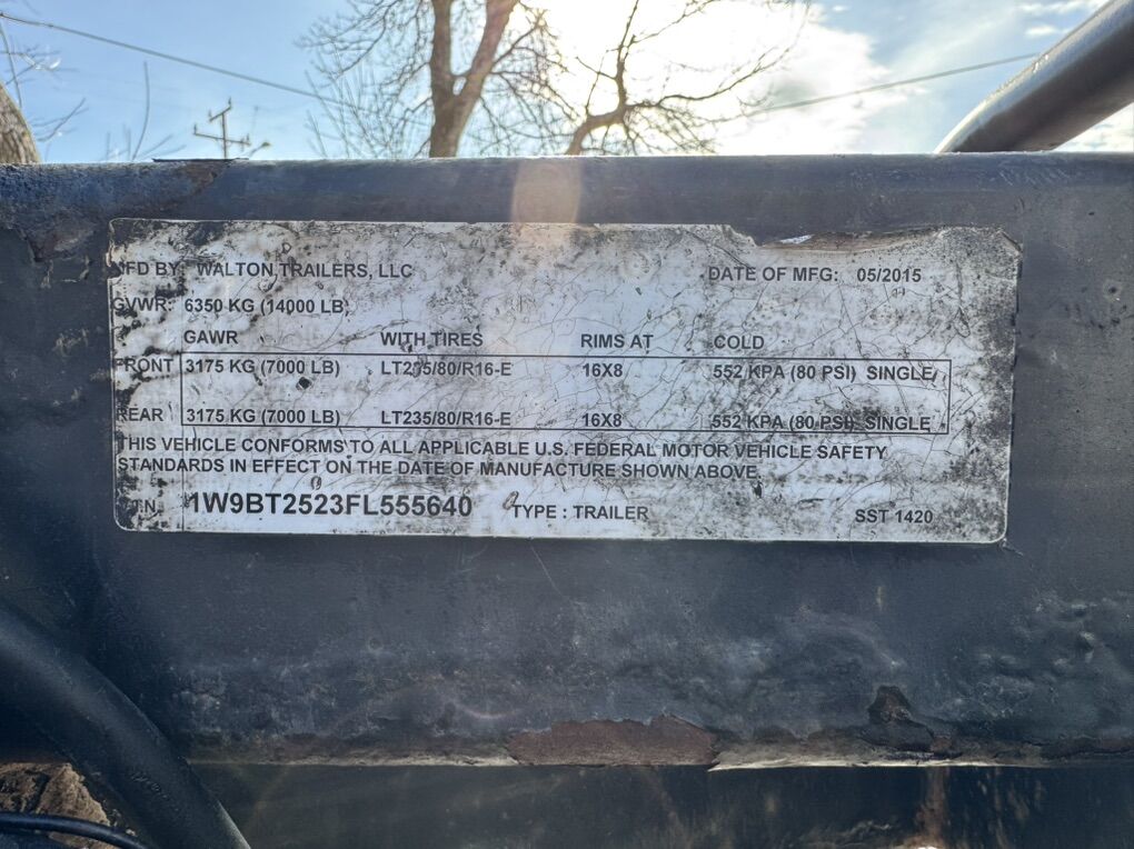 Venmo2015 Walton tilt deck trailer with 14,000 GVWR. Trailer tows straight and tracks nicely behind the truck. Deck is in good shape and everything works as it should. built-in storage for chains and straps. Tires are in great condition with a 2024 date stamp.