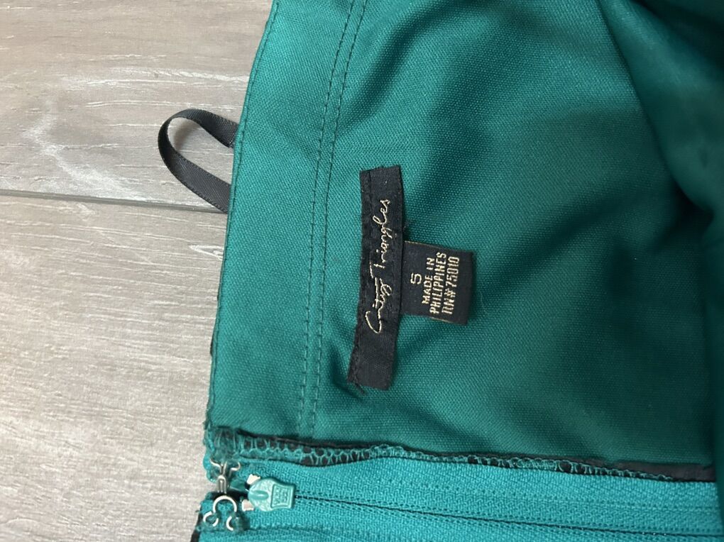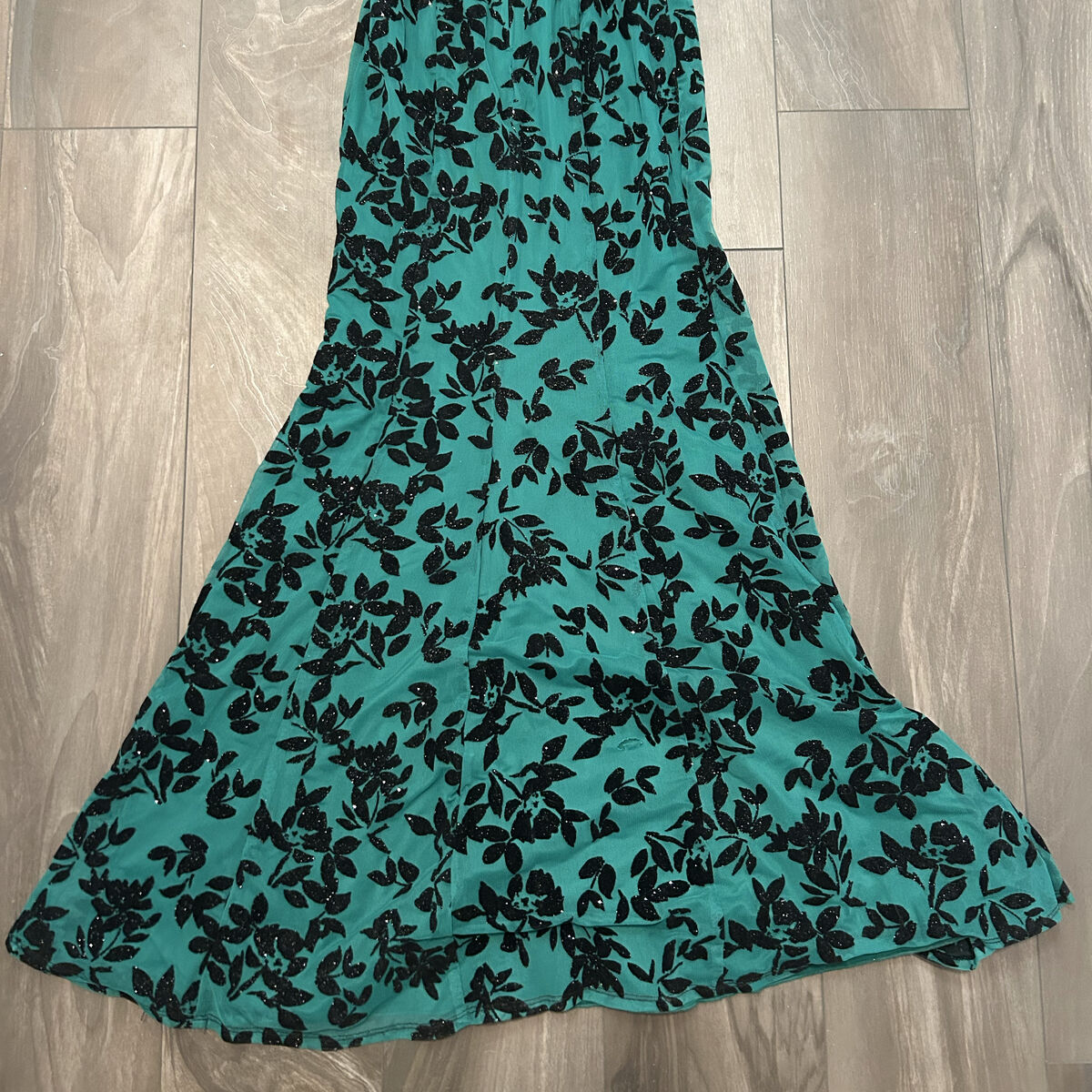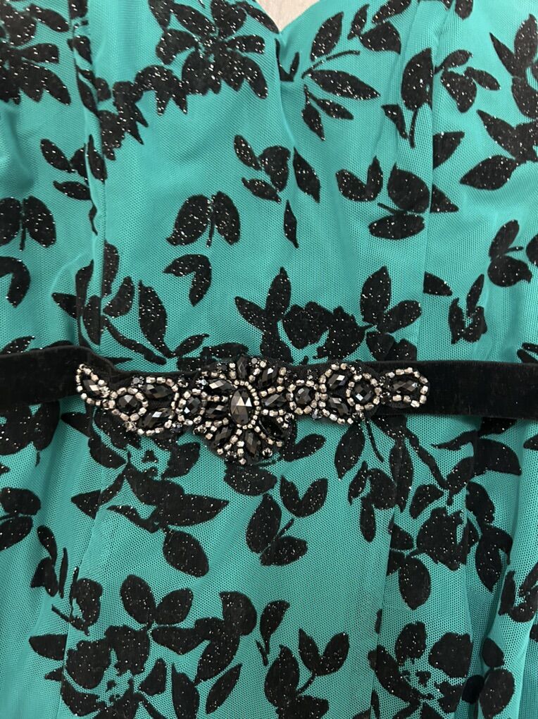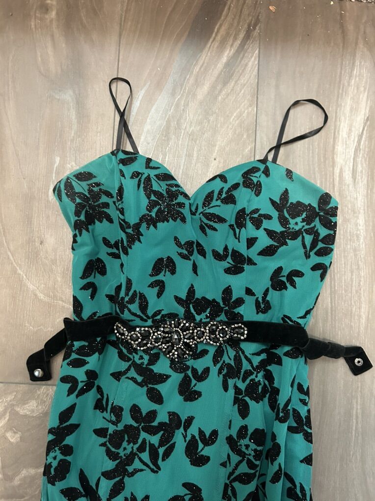 VenmoGreen Dress with black floral detail, built in pads, small sparkle detail, and sequin belt. Used once and in very good condition Size: 5 Open to offers