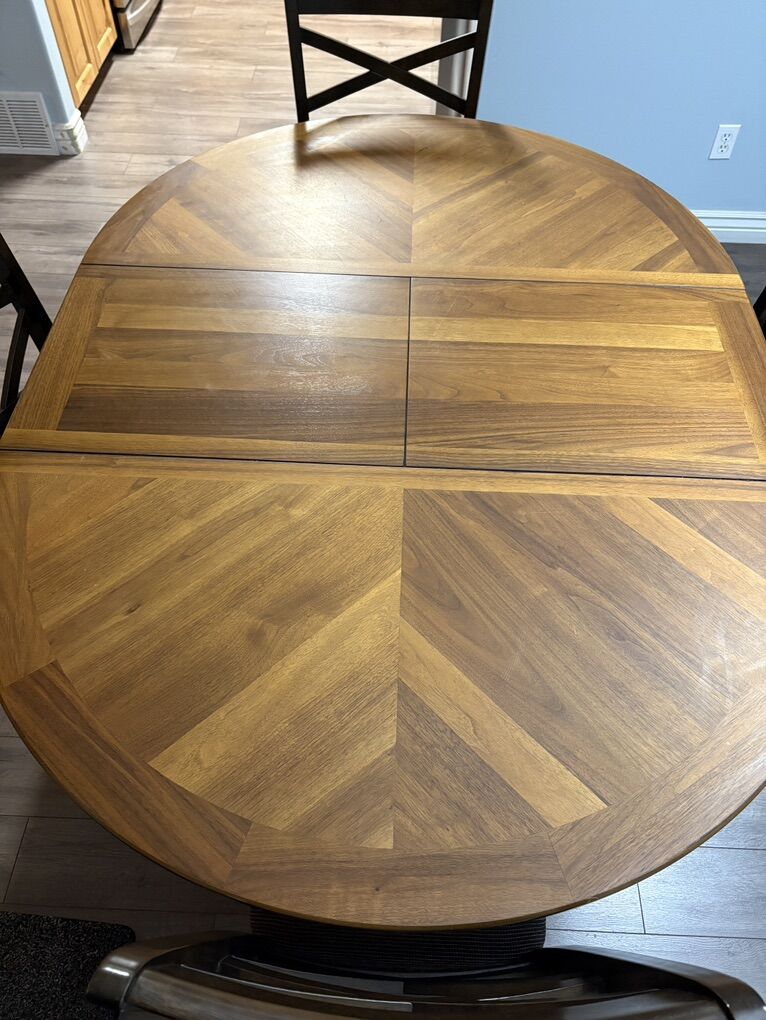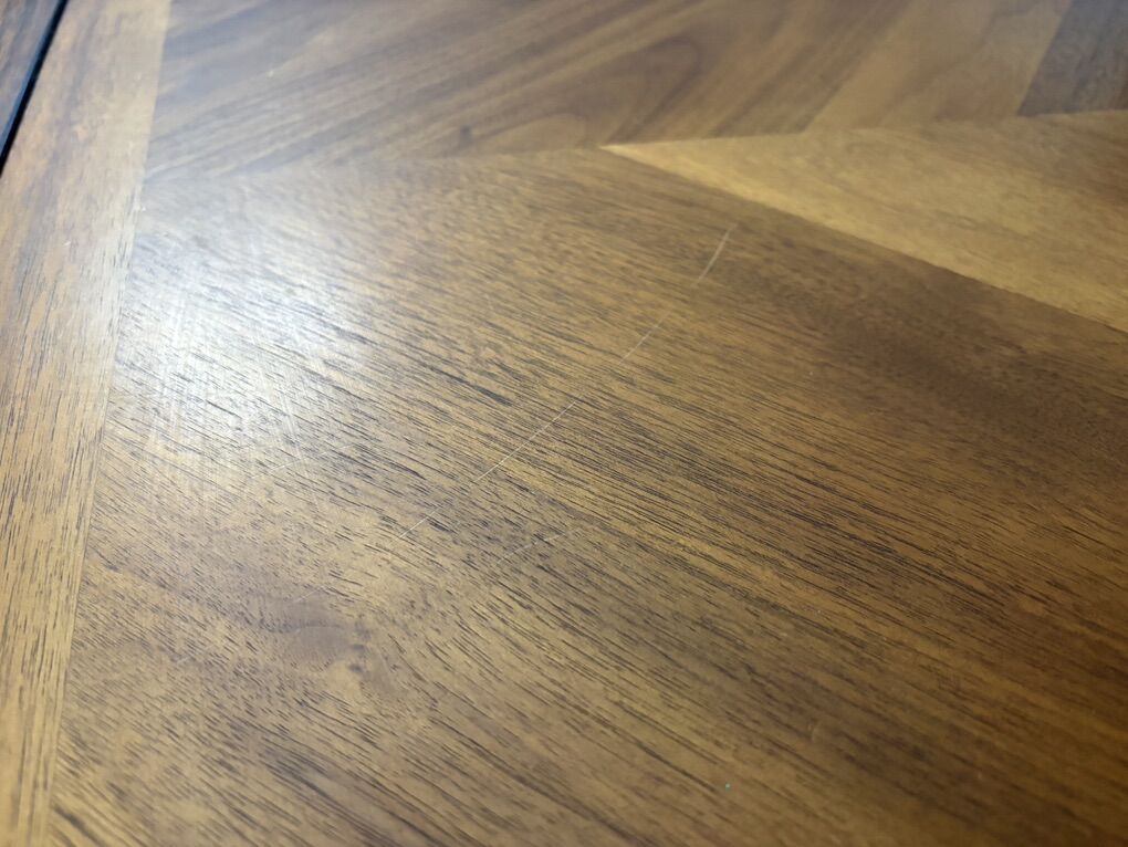 Not sure what type of wood, but it is definitely walnut colored. There is some normal wear and tear (took a picture of one scratch), but an overlay would take care of it. Table works great, just had to get a bigger one.