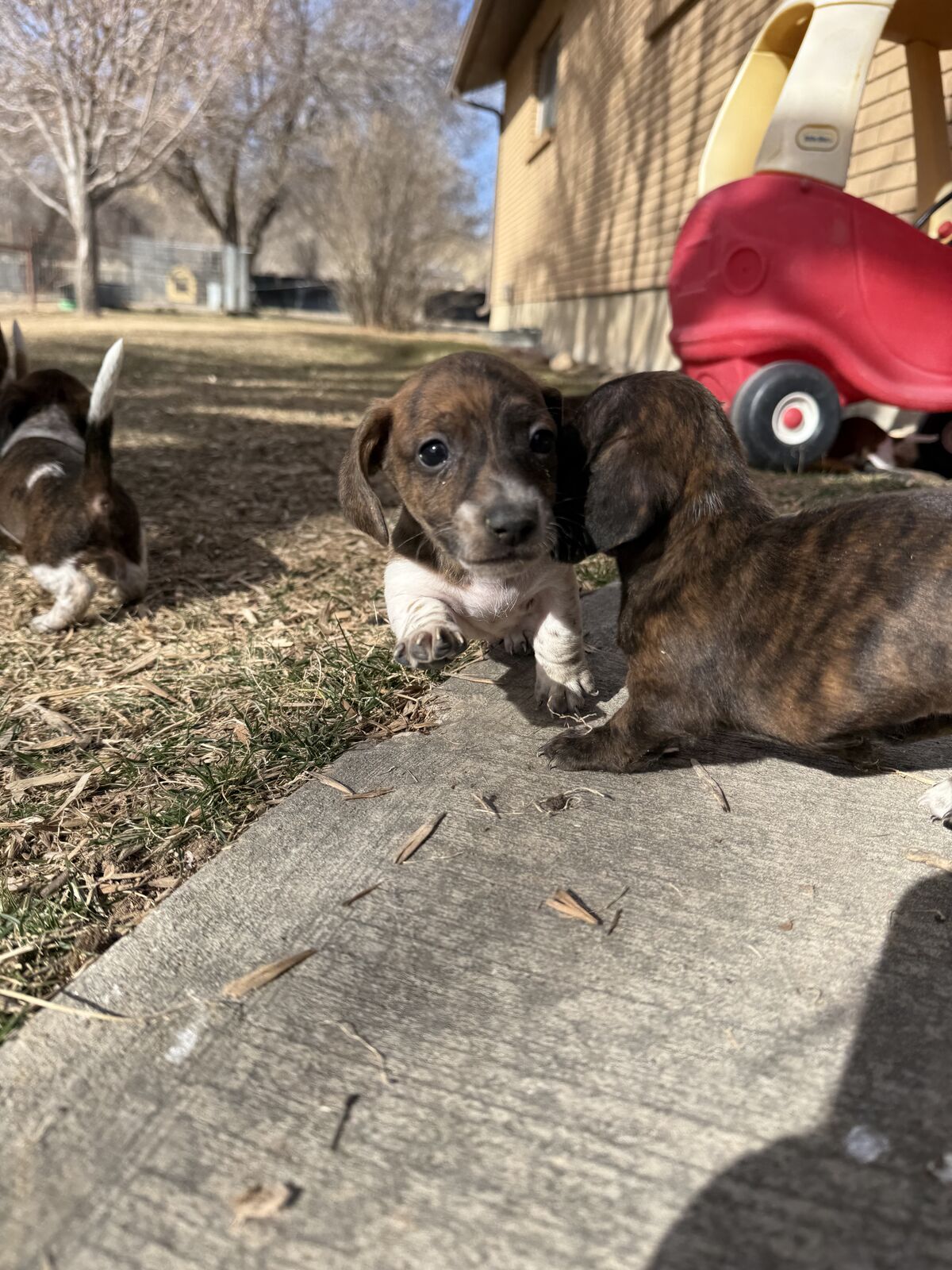 VenmoWe welcomed 7 beautiful pups on January 22nd. 2 females, 5 males. 6 brindle piebalds, 1 cream piebald. All short hair. Puppies are sold as pet only, no breeding rights. We strive for quality over quantity. We are not a large scale breeder that breeds what we can find and all about profit. Our dogs are carefully selected and members of our family. We look for healthy, breed standard dogs. We take into consideration their temperament, conformation, size, and health. Our dachshunds are true minis. All under 12 pounds. This litter is from our brindle piebald female, “muffin” and our blue and cream male, “otter” mom is 11 pounds and dad is 7.5 pounds. Both parents are fantastic with children, all people, and dogs. They’re smart, and really such great dogs. They aren’t yappy, they don’t get annoyed with kids, they’re really kind dogs. Puppies are handled from day one. They will come with vet checks, first shots, and started on potty and crate training. They’ll be ready middle of march. With any questions please text or call.