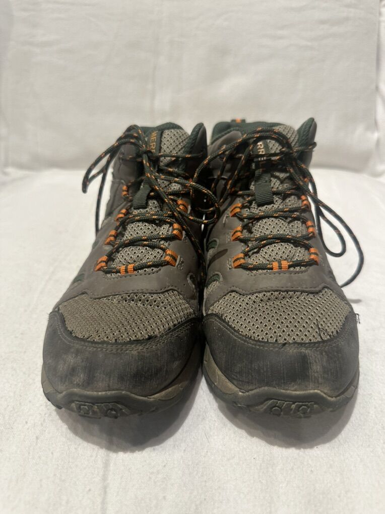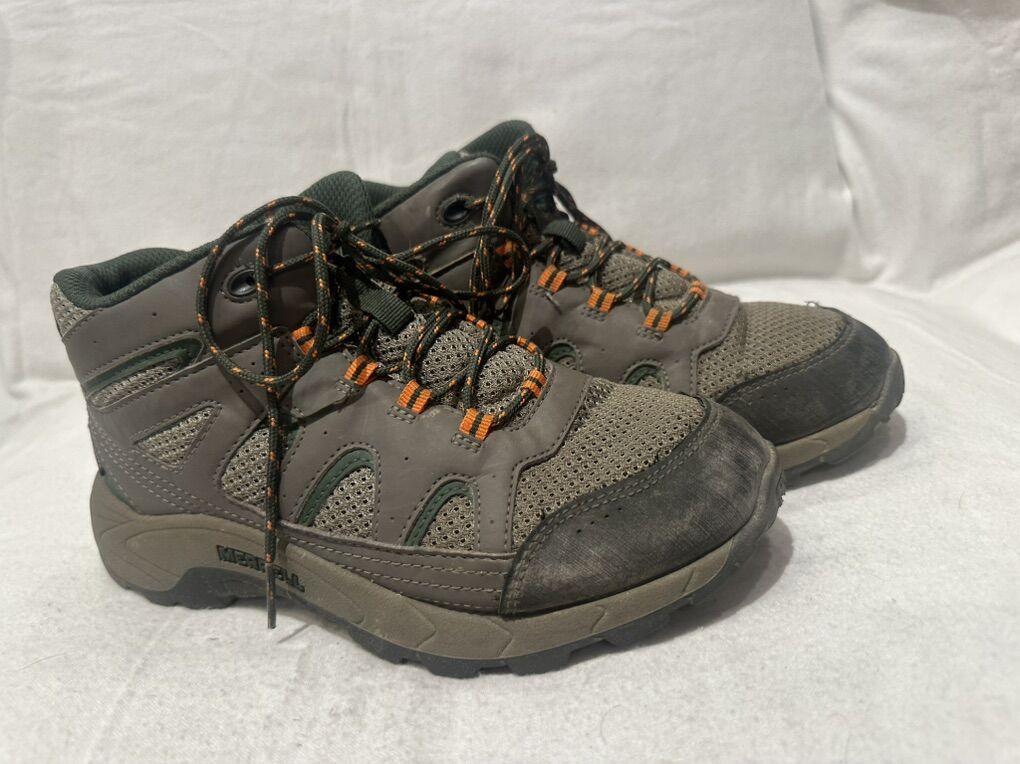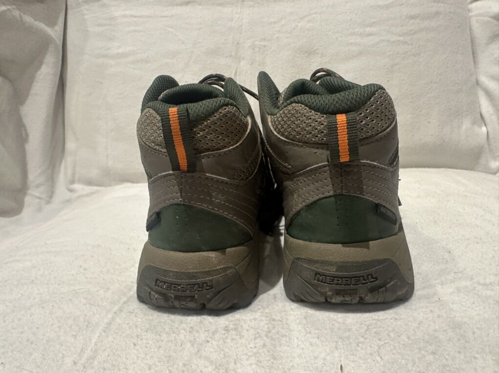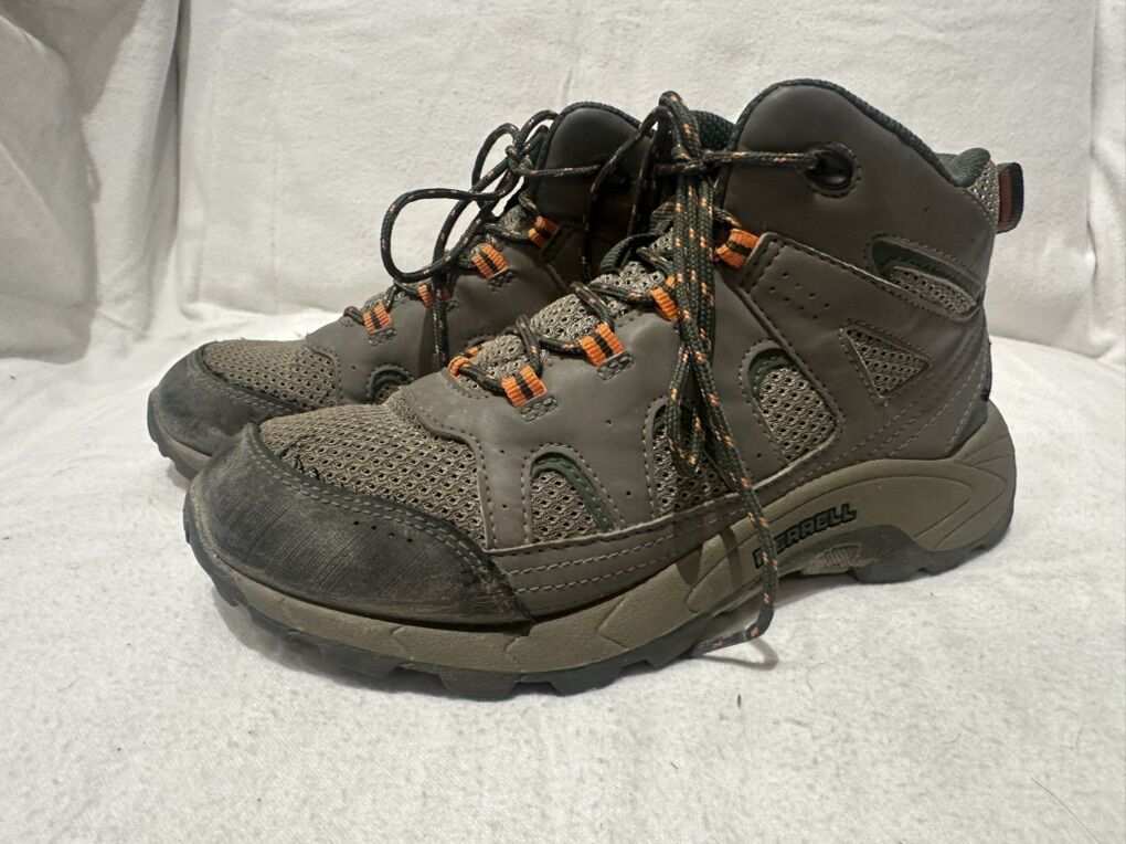 Merrell beige with green and orange trim youth, size 4 leather and mesh waterproof, hiking shoes. Is there in good condition, see photos for details. I take cash or Venmo, but cash is preferred. Text is best. 801-201-4446. Check out my other ads for additional sizes and styles.