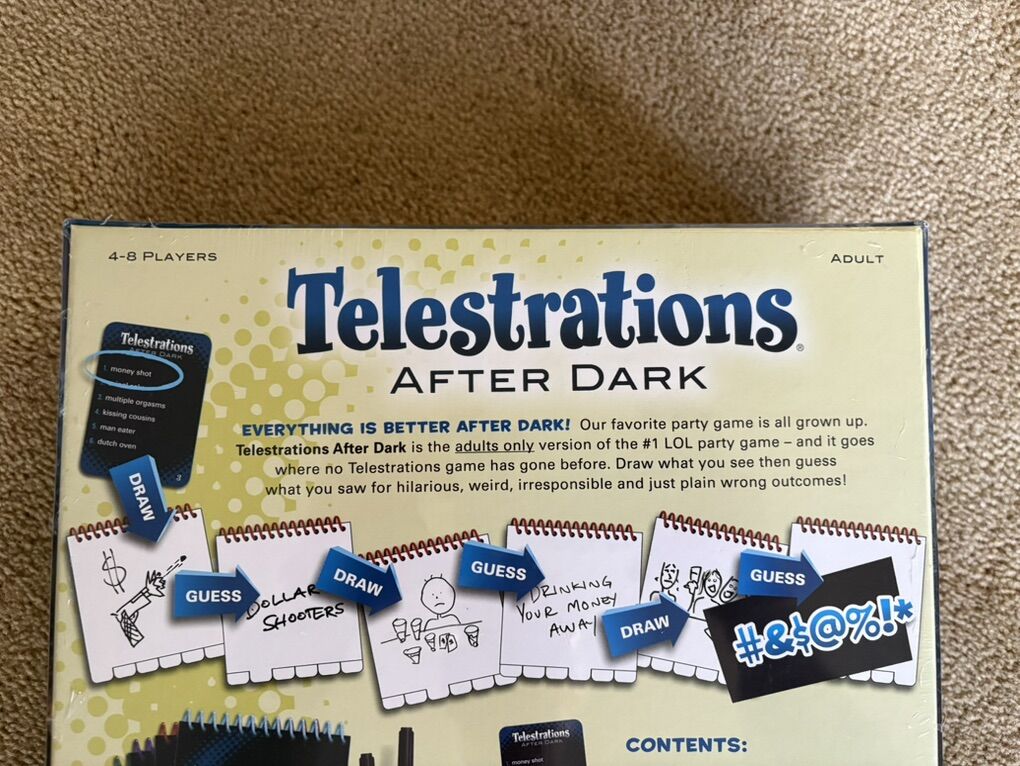 NEW (sealed in plastic) Telestrations: After Dark. The adult-only party game all sketched out. An adult version of the classic “telephone” party game. For adults, 4-8 players. USAopoly, 2015. New, unopened condition. Text only. Cash or Venmo.