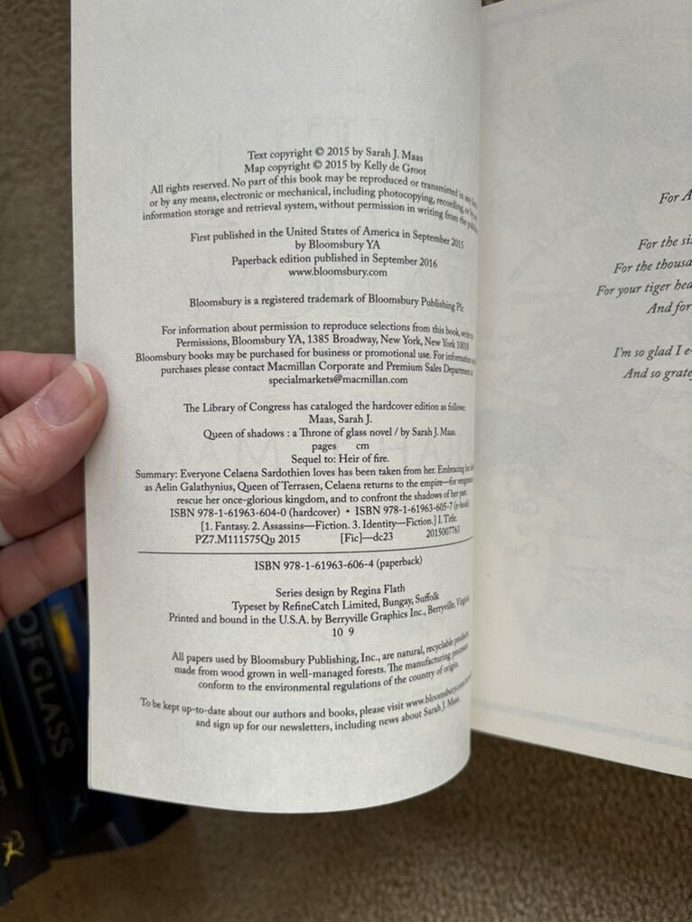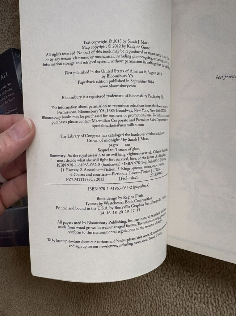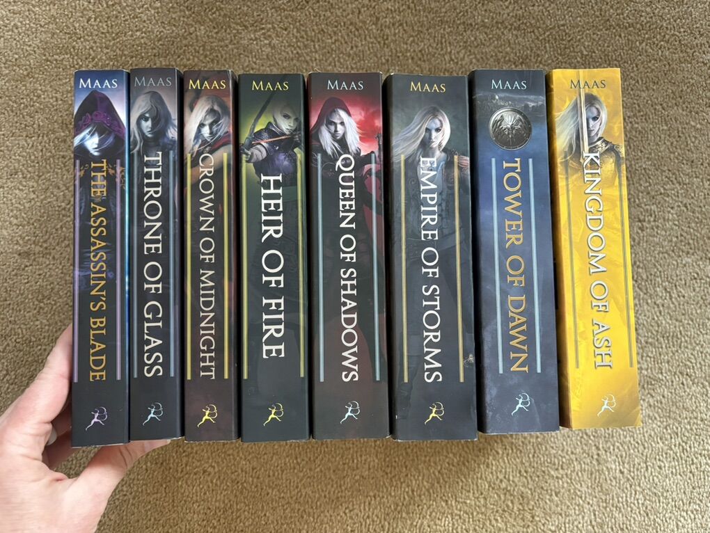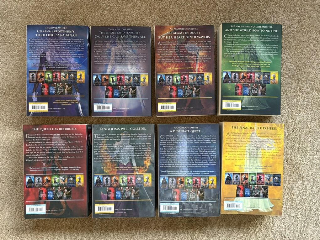 Throne of Glass Complete Series, by Sarah J. Maas: The Assassin’s Blade (Novellas/Prequel, 2014, 435 pages), Throne of Glass (2012, 406 pages), Crown of Midnight (2013, 420 pages), Heir of Fire (2014, 565 pages), Queen of Shadows (2015, 648 pages), Empire of Storms (2016, 693 pages--one small tear on first page), Tower of Dawn (2017, 663 pages), and Kingdom of Ash (2018, 980 pages). Bloomsbury. Paperbacks in excellent condition. No marks, all spines unbroken. Text only. Cash or Venmo.