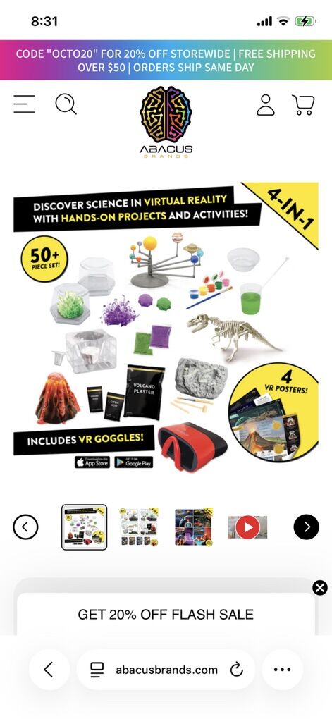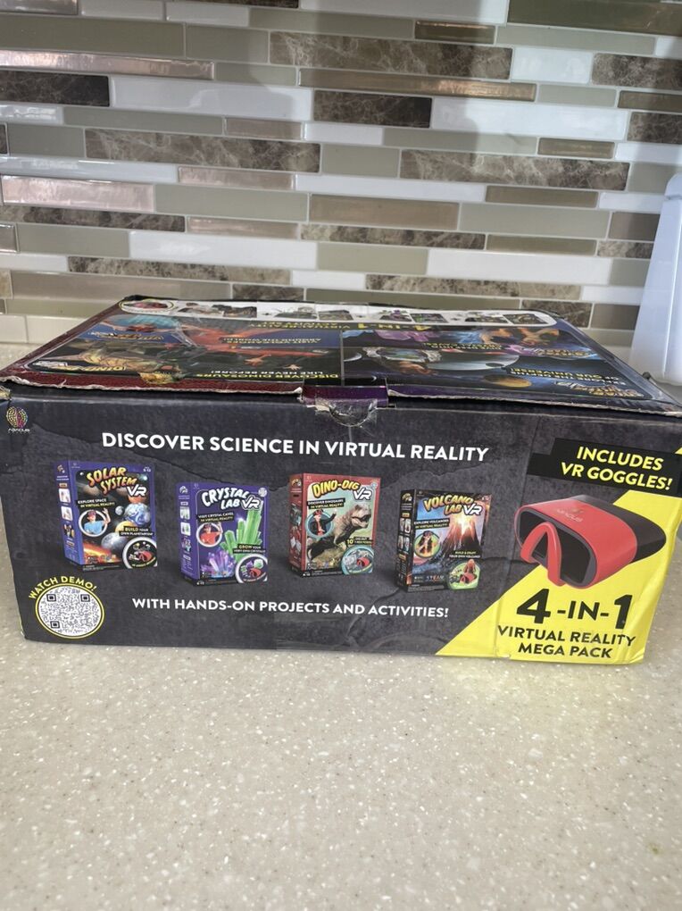 VenmoAbacus Brands 4-in-1 Virtual Reality Mega Pack science kit. • It includes four hands-on projects: building a planetarium, growing crystals, digging for a T-Rex fossil, and erupting a volcano. • The kit comes with a VR headset that works with most smartphones (via a free app) to provide over 35 immersive virtual reality experiences. • It is designed as a STEM learning activity set for ages 8-12. • It includes over 50 pieces for the physical projects.