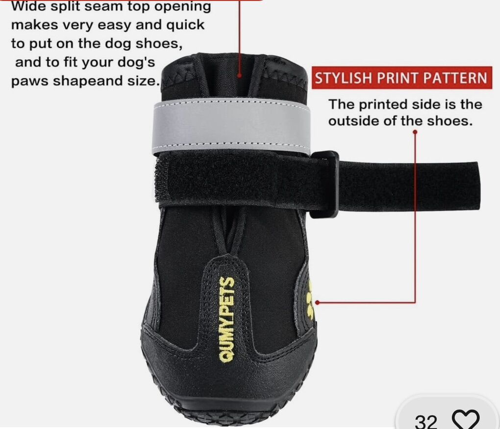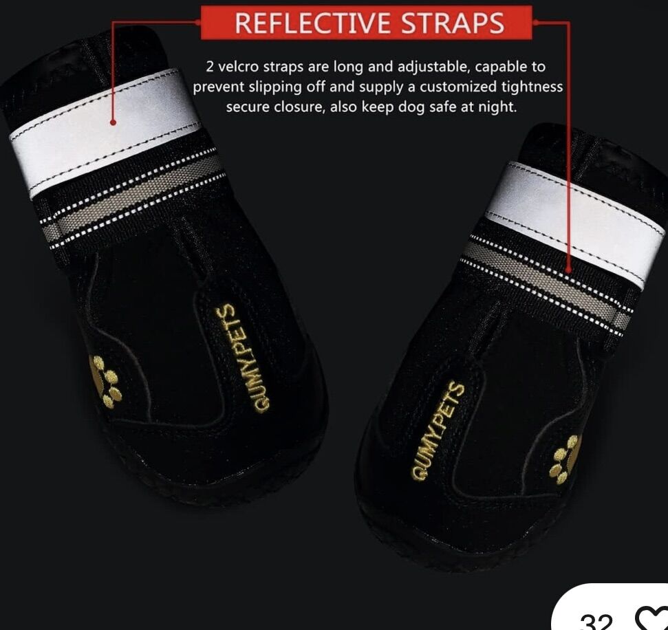VenmoQUMY Pet dog boots. • The boots are waterproof and designed for paw protection against elements like snow, ice, and hot pavement. • They feature a tough anti-slip sole for stability and traction. • The design includes two adjustable, reflective straps to ensure a secure fit and nighttime visibility. • QUMY Pet is a company that manufactures various pet products. $5 a pair