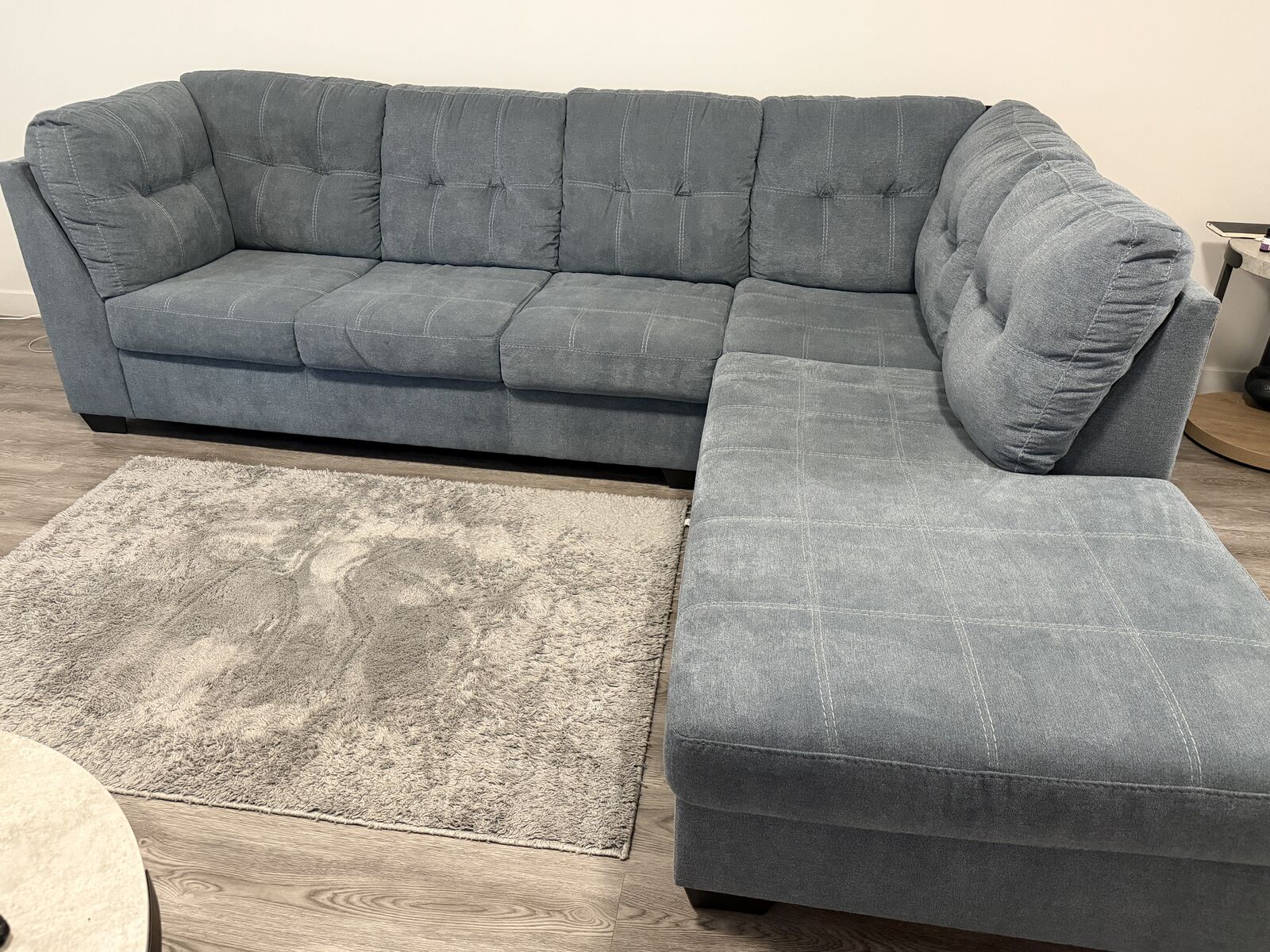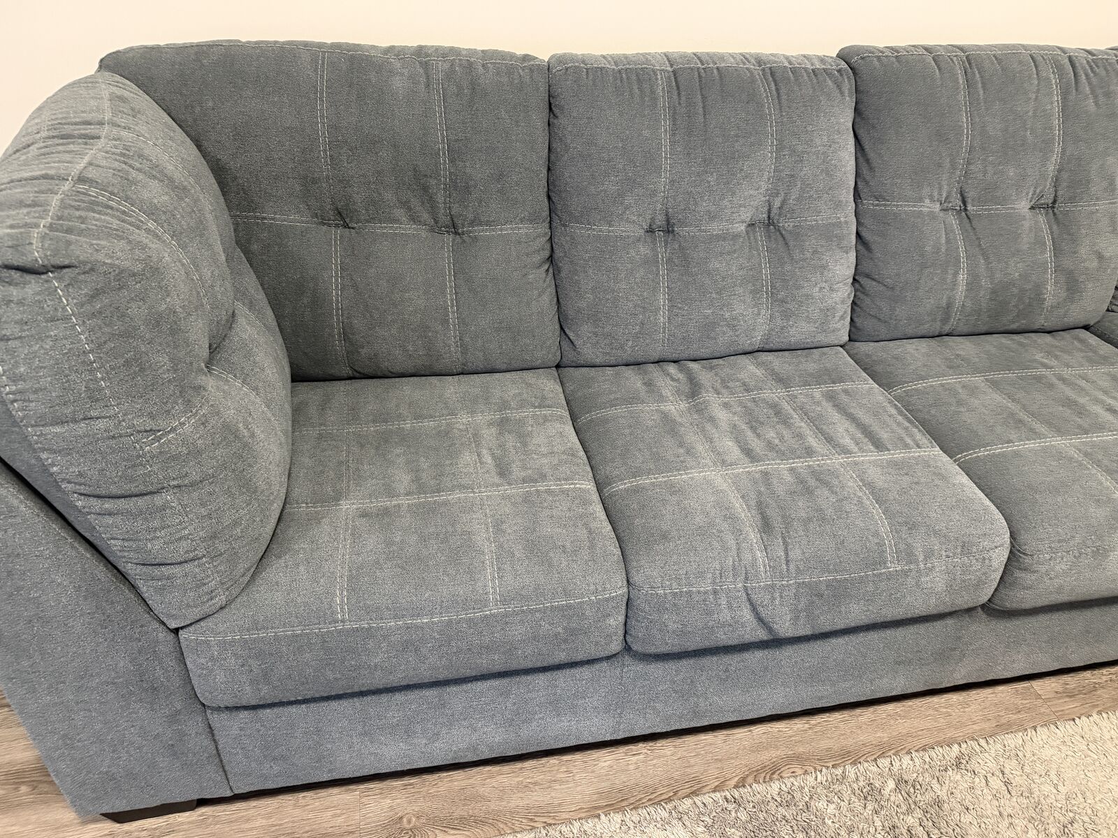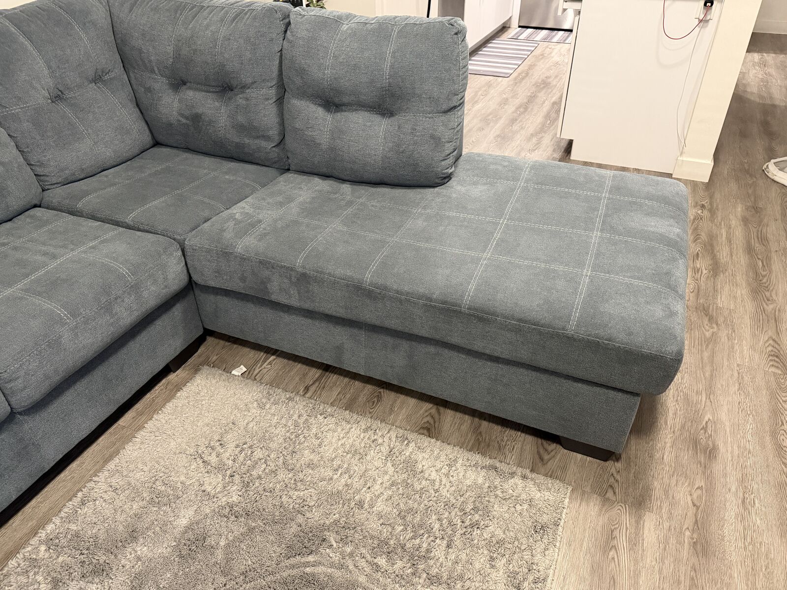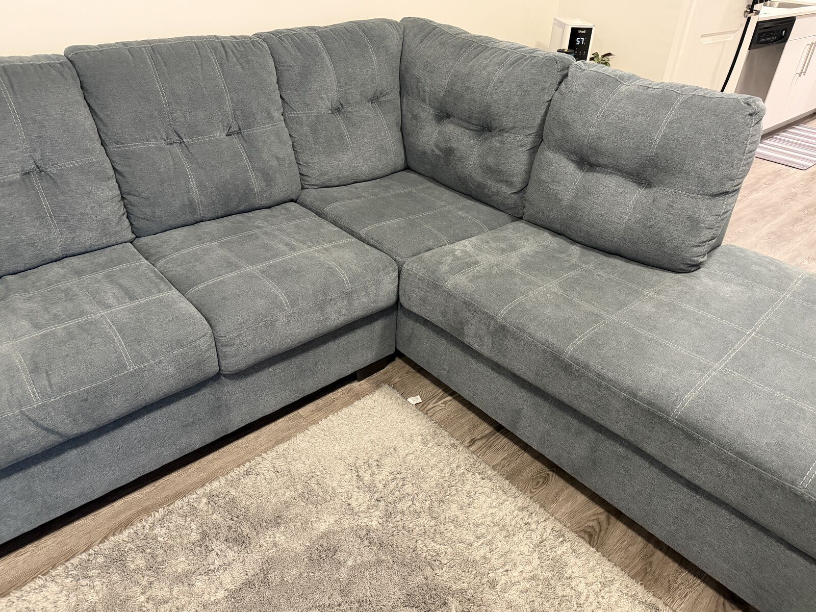 ZelleSectional with chaise blends comfort and modern style effortlessly. The denim‑inspired upholstery gives it a versatile, timeless look, while the clean lines and stitched detailing add a contemporary touch. It’s designed for everyday relaxation—the spacious chaise is perfect for stretching out after a long day.