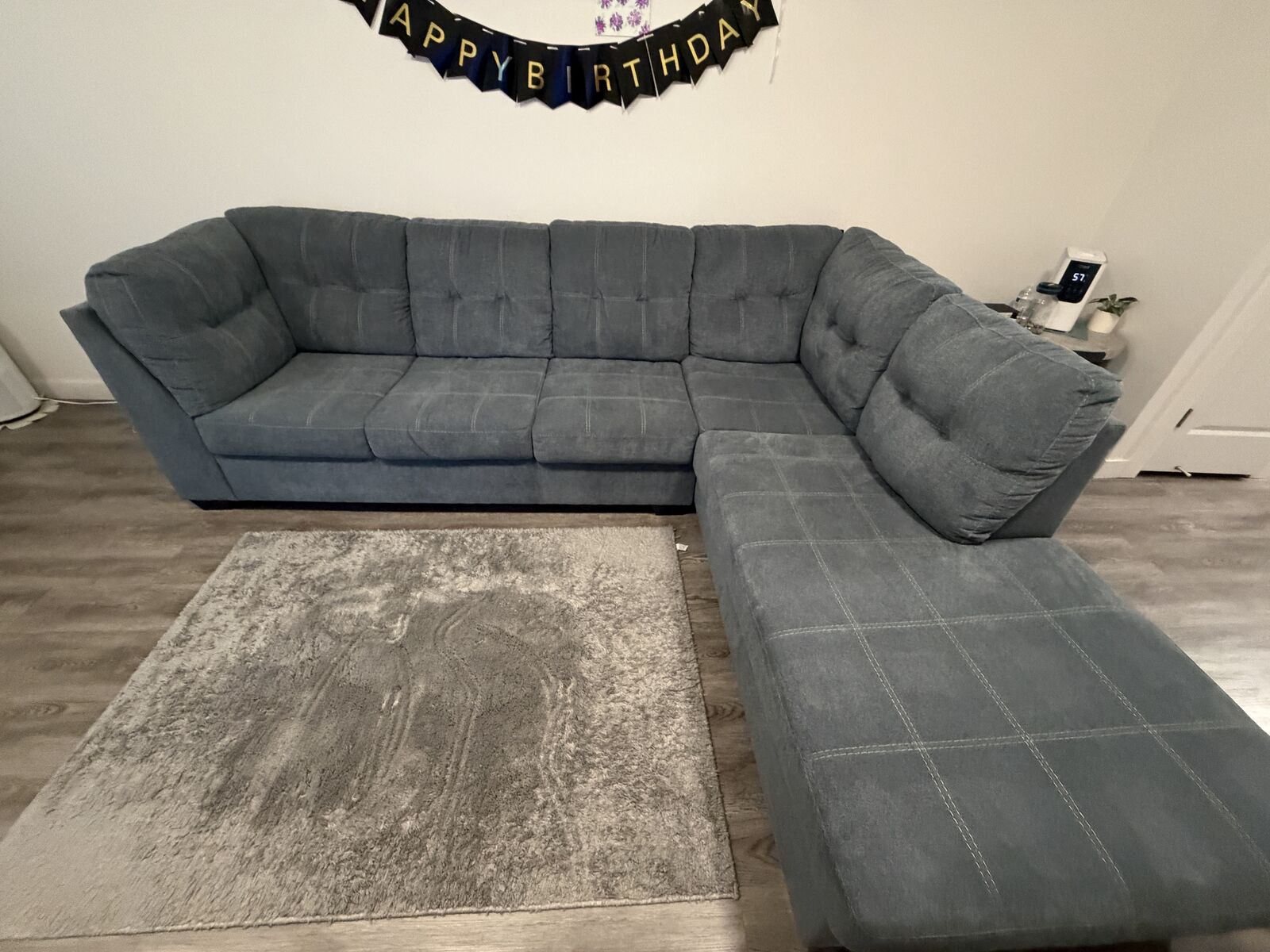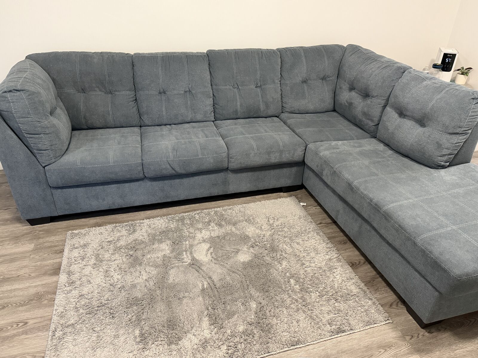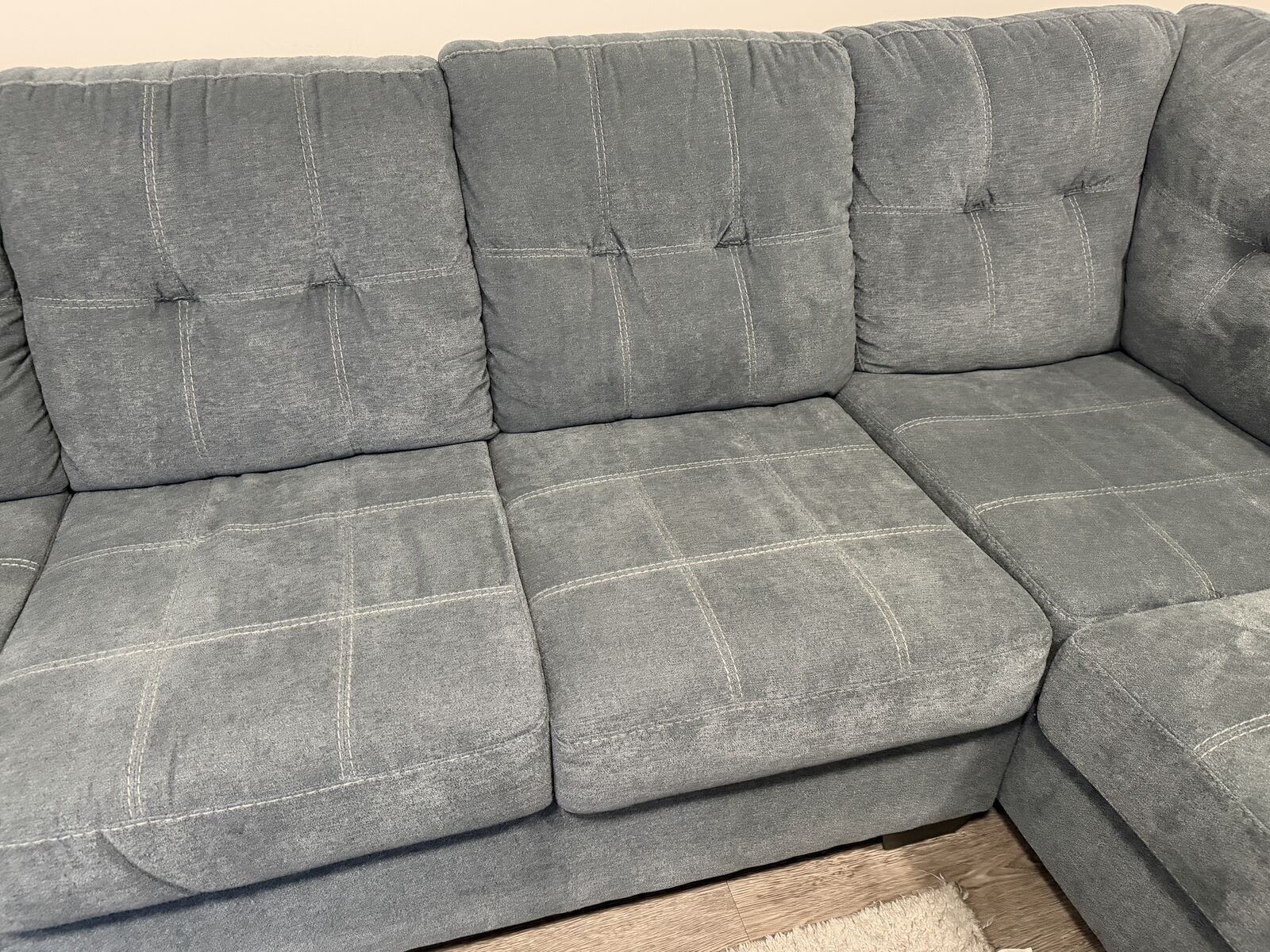 ZelleSectional with chaise blends comfort and modern style effortlessly. The denim‑inspired upholstery gives it a versatile, timeless look, while the clean lines and stitched detailing add a contemporary touch. It’s designed for everyday relaxation—the spacious chaise is perfect for stretching out after a long day.