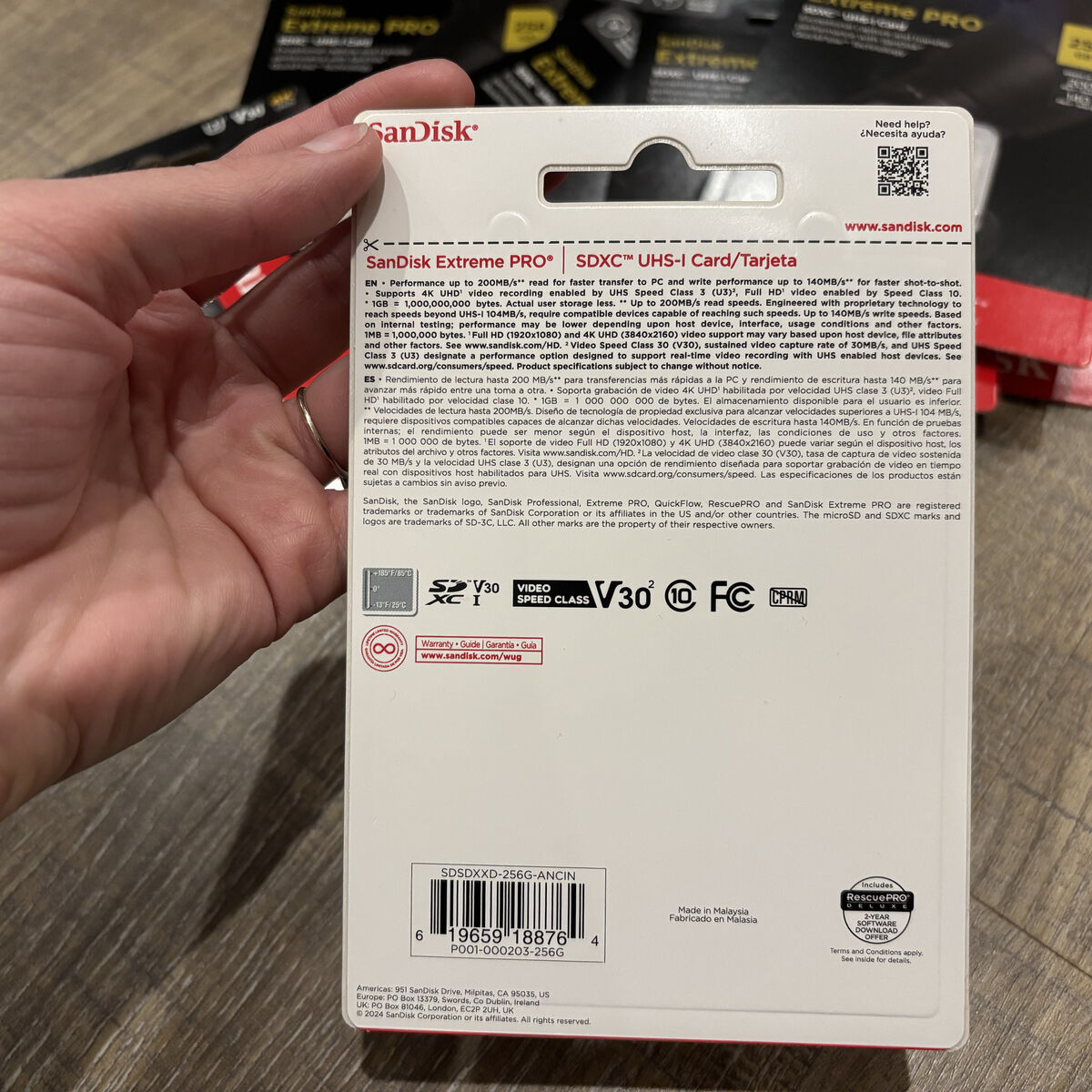 Specs: • Brand: SanDisk • Model: Extreme PRO • Capacity: 256GB each (total 2.56TB) • Type: SDXC UHS-I • Speed Class: V30 / U3 / Class 10 • Up to 200 MB/s read, 140 MB/s write • Supports 4K UHD video recording • QuickFlow technology