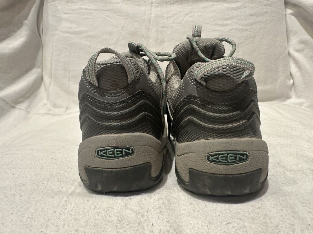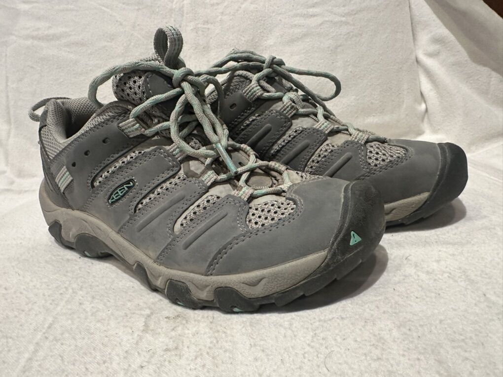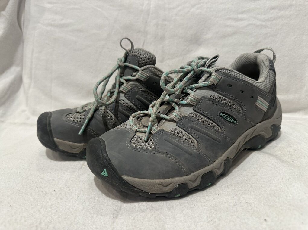 Keen women’s size 8, gray with mint green trim, leather and mash hiking shoes. These are in good condition, see photos for details. I take cash or Venmo, but cash is preferred. Text is best. 801-201-4446. Check out my other ads for additional sizes and styles.