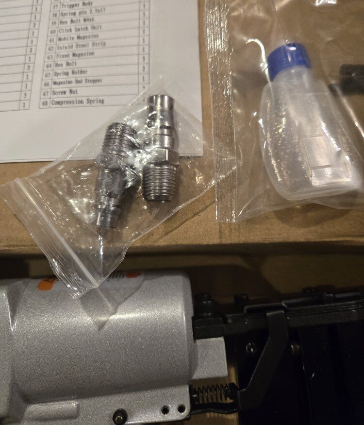 Venmobrand new runs of air compression has all parts including instructions and maintenence oil get a solid nailer/stapler for less than 1/2 the price of the big brand stores. text with any questions
