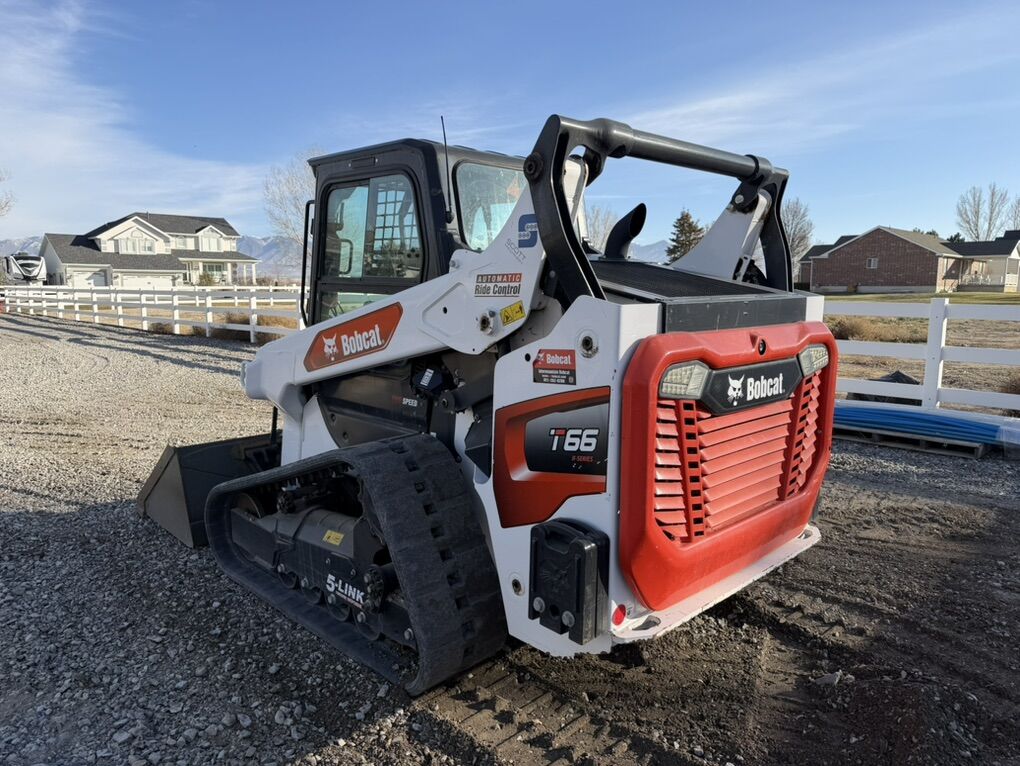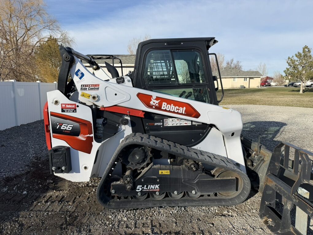 2020 Bobcat T66. It has 1,400 hours. It is equipped with the gold package, which includes every option available. On top of the gold package, it has torsion 5-link suspension, high flow, and 2-speed travel. It is also equipped with wide tracks, so the overall machine width is just under 74”. It includes a 74 heavy-duty bucket and 48 pallet forks. It has had all service done on time by Intermountain Bobcat in Salt Lake. It has had the seat cover on it since day one, so the seat is in perfect condition. We have had no issues with this machine; everything works great.