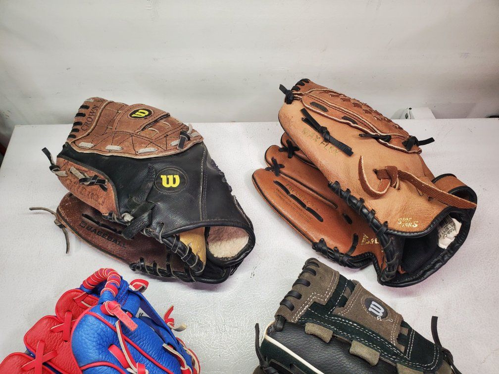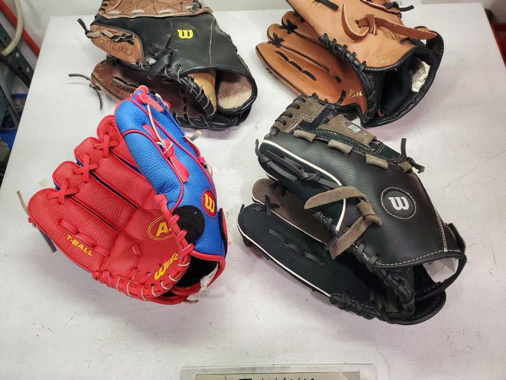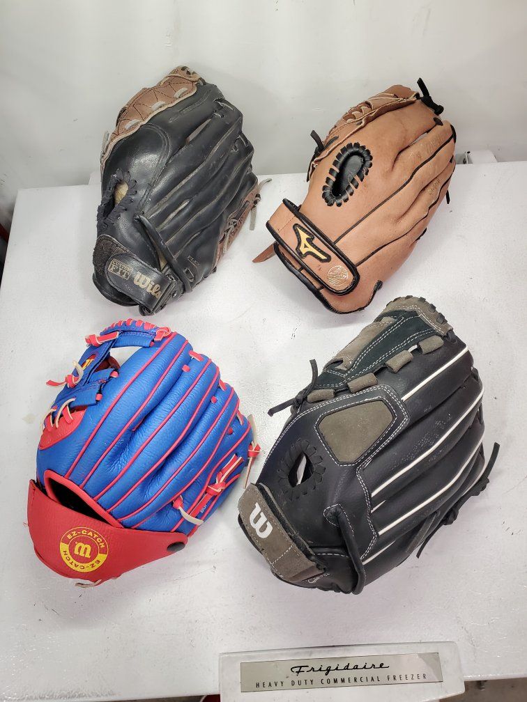 VenmoThese are baseball mitts for lefties, throw with the left hand, catch with the right. The red and blue one is a 10" T-ball mitt. The other two Wilsons are both 11". The brown Mizuno on the back row is 11.5" and $15. The other three are $10 each. The black and gray 11" Wilson has been sold.