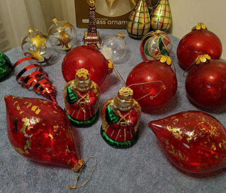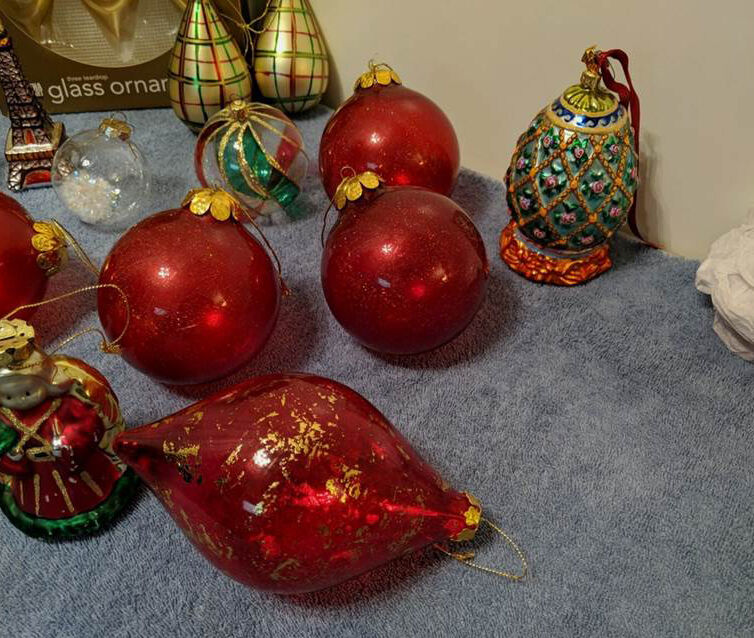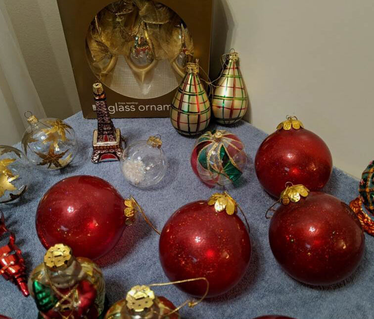 Venmogorgeous glass ornaments + four, red and green colored tin coil springs.