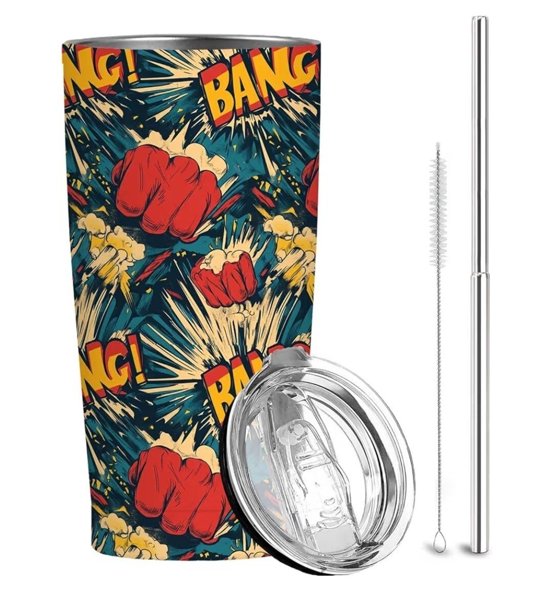 Pop-Art Comic Book Style 20 oz Tumbler, Anime Cartoon Stainless Steel Travel Mug, Insulated Hot & Cold Drink Cup, Christmas or Birthday Gift for Men and Boyfriend, Hero-Themed Printed Pattern