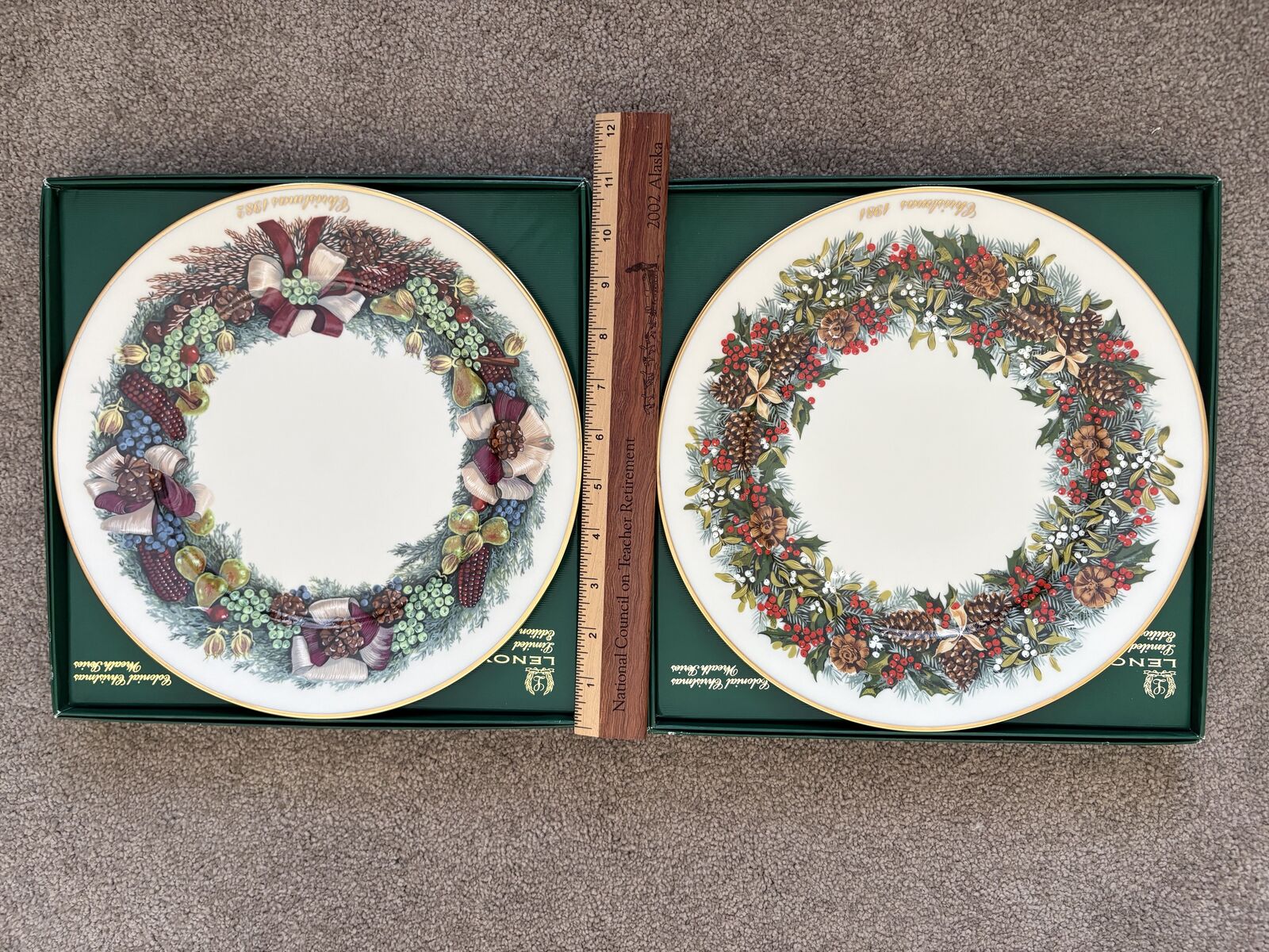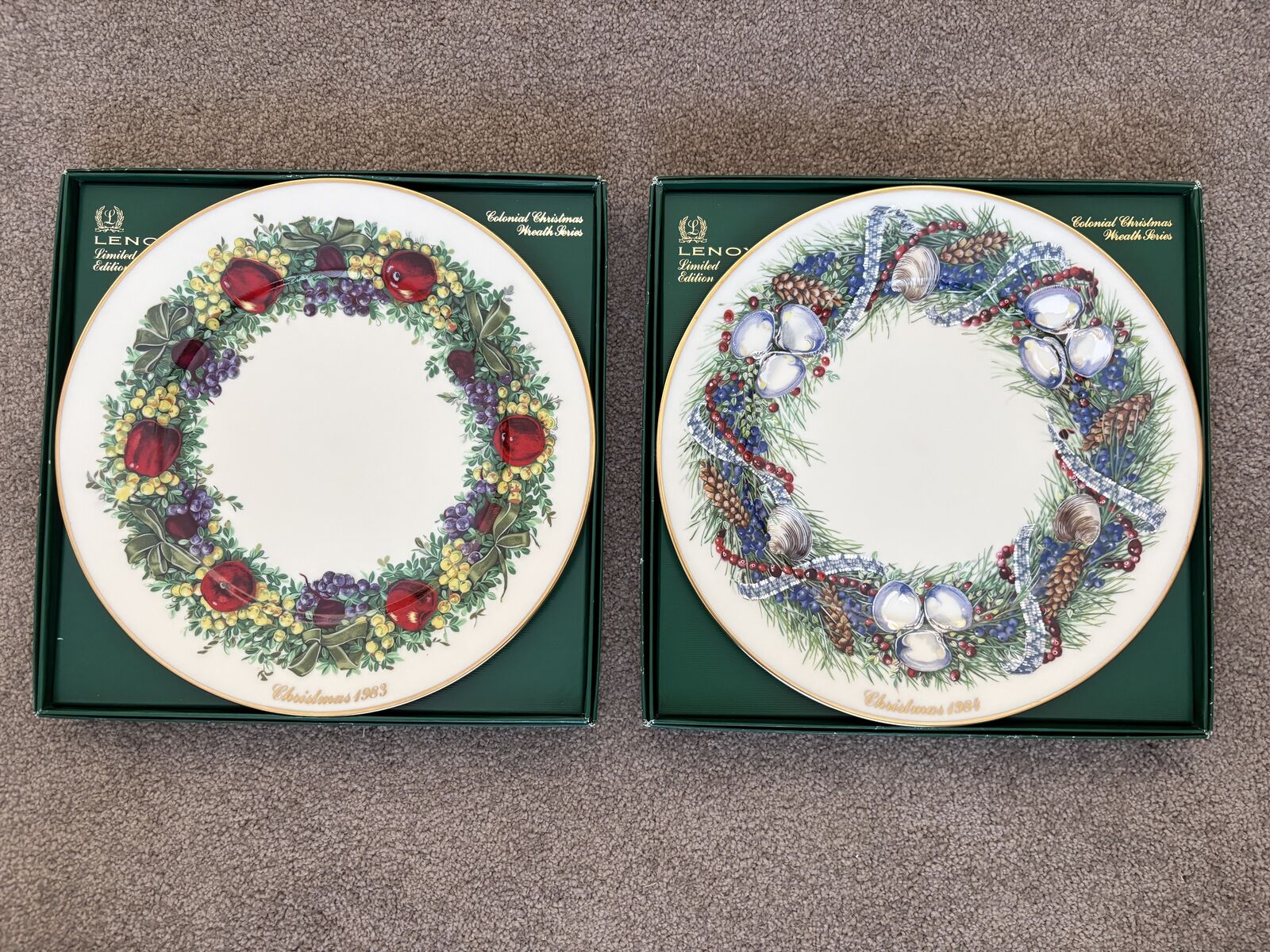 Set of 13 Lenox plates, each plate represents one of the 13 original colonies; one plate was offered only at Christmas time for 13 years from 1981 to 1993; each plate has a wreath design; plates are handcrafted in ivory Lenox; plates are in their original boxes; some of the plates have never been used!