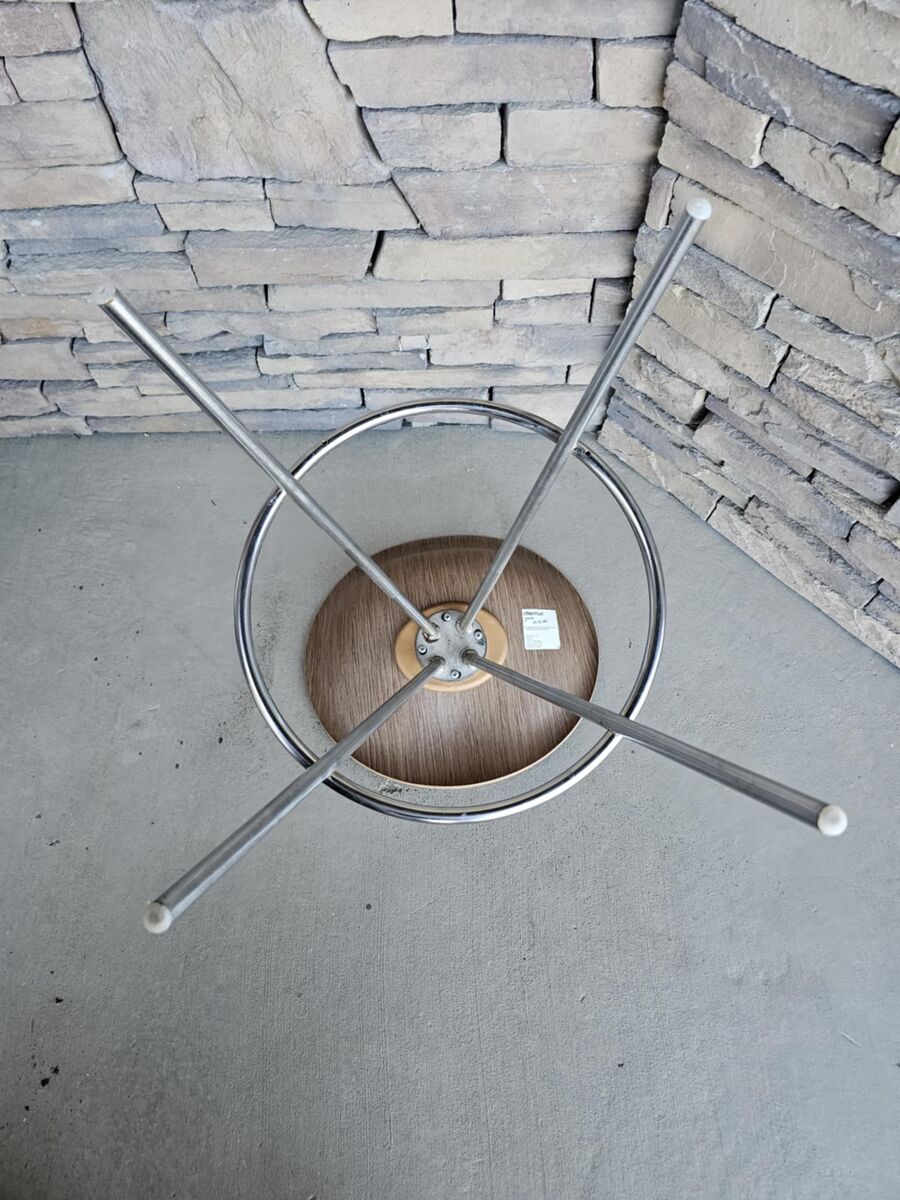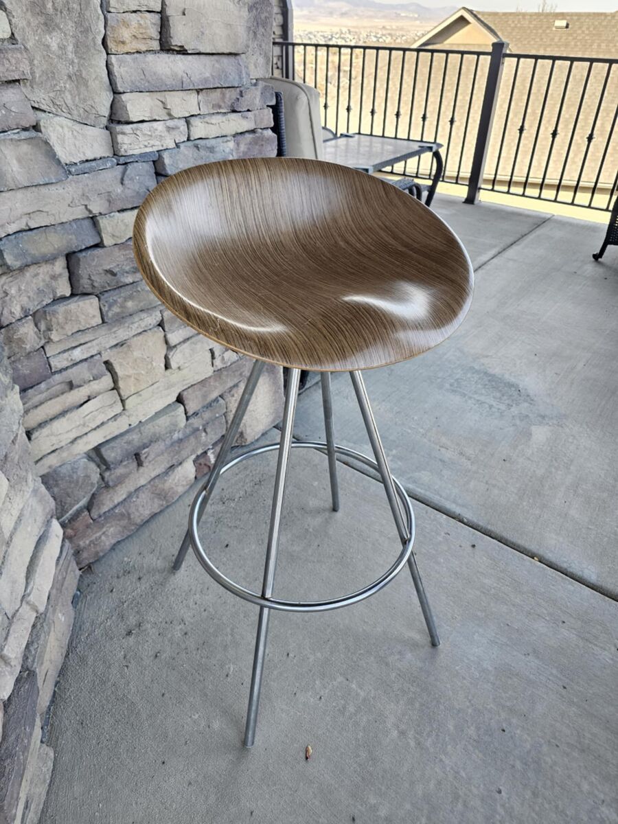 Allermuir JoJo bar stool with molded dark oak seat, grey metal legs, and integrated circular footrest. Clean modern design. Manufactured in the UK.