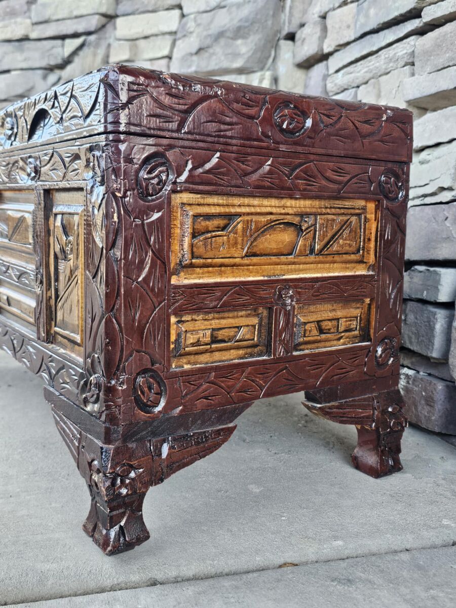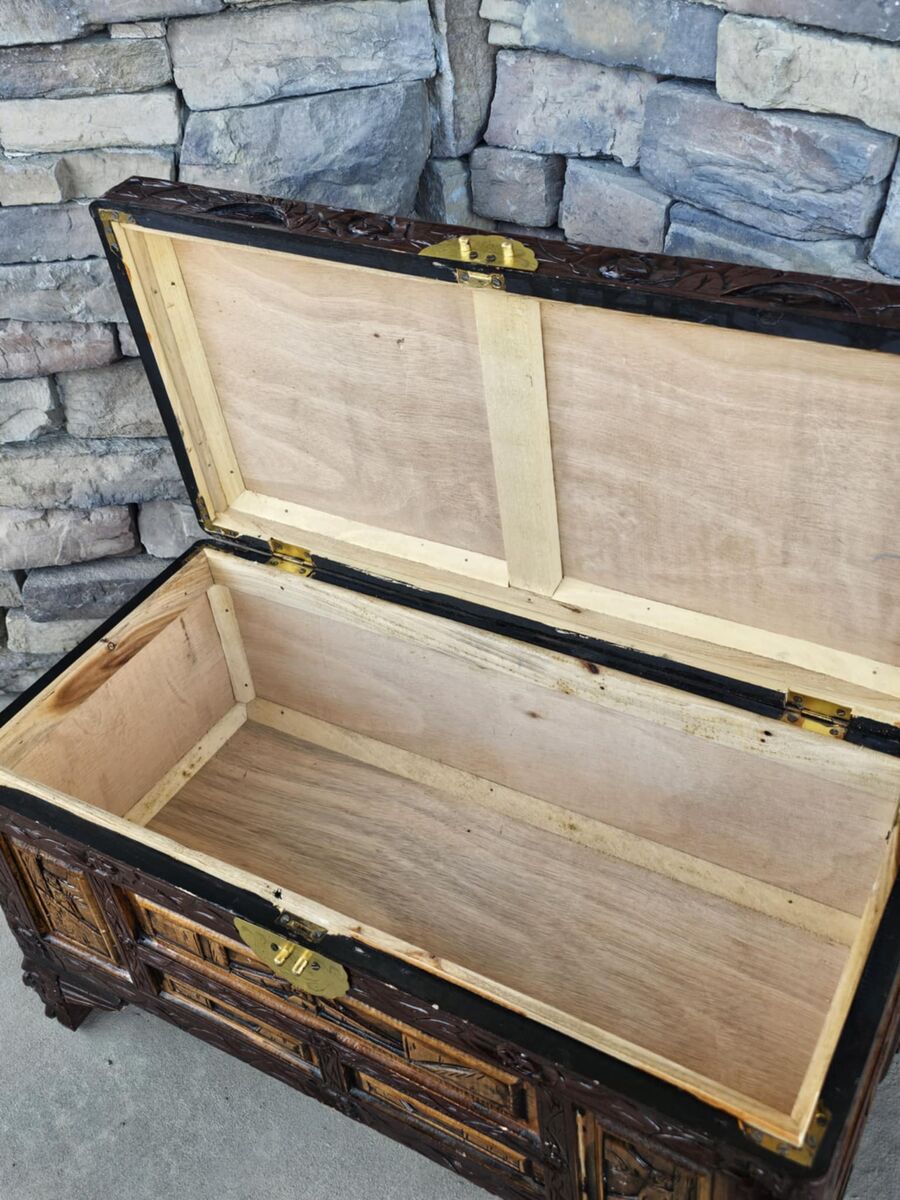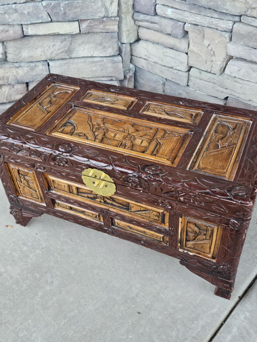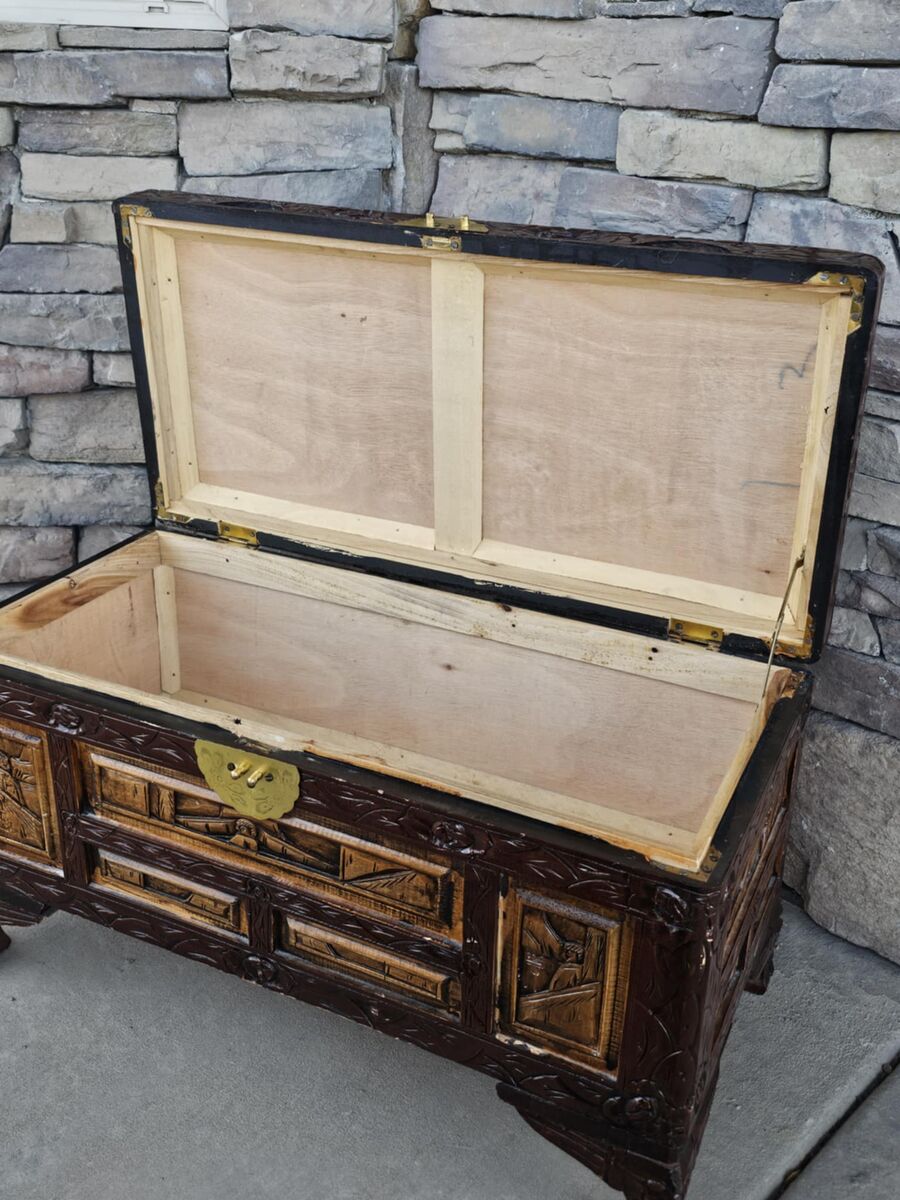 VenmoVintage Carved Wooden Storage Chest / Trunk – Asian Motif, Brass Hardware