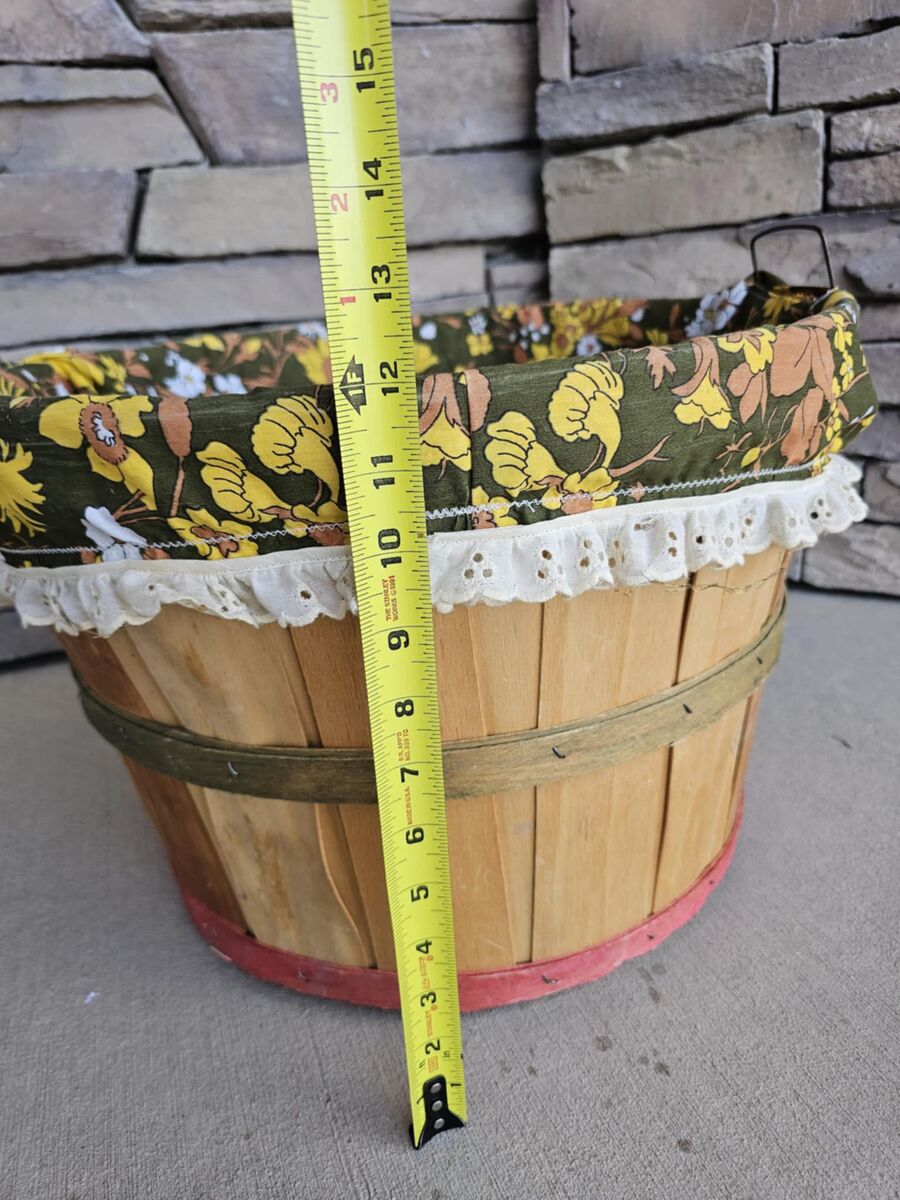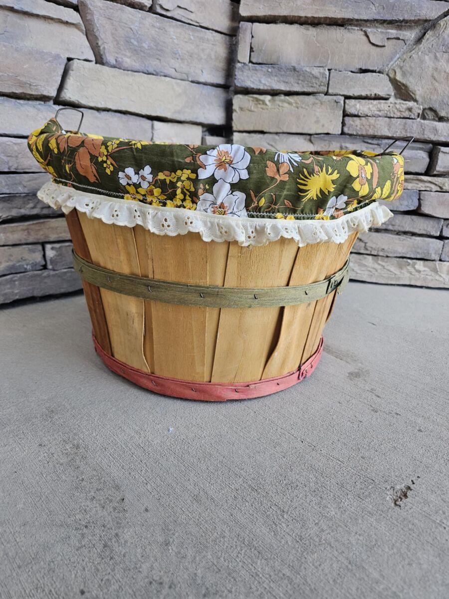 Small vintage wooden bushel-style basket with wire handles and removable floral fabric liner with lace trim. Solid wood slats with painted metal bands. Works well for storage, décor, or as a planter basket (liner included).