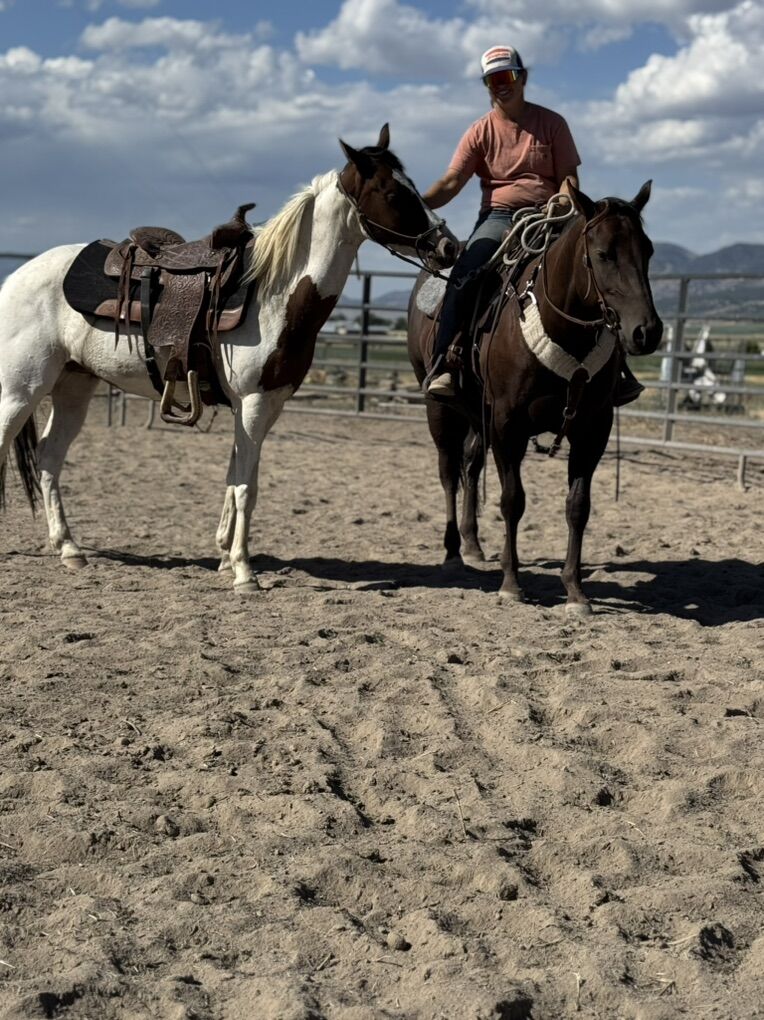 About Penny: • Registered – papers in hand, transfer ready • Lightly started and progressing well – now riding daily with about a dozen rides under her belt • Smooth trot and lope – comfortable to ride and showing great potential • Athletic & balanced – great movement with a naturally willing attitude • Gentle disposition – kind, curious, and enjoyable to be around • Just under 14 hands – compact, athletic build with more growing to do • Mountain exposure – packed weight, traveled in the mountains, ponies quietly, and takes new experiences in stride • Eye-catching markings – flashy paint patterns that always get noticed