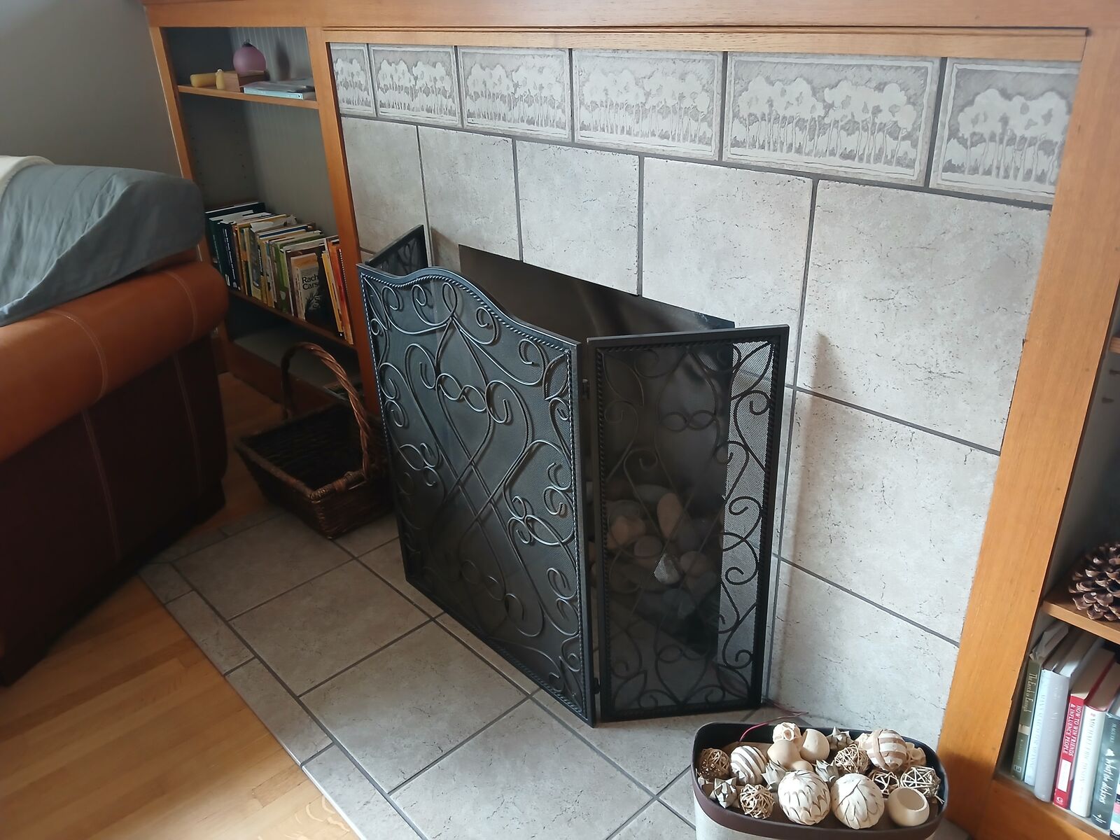 The screen is in excellent condition and has been well cared for. The hinged side panels allow it to stand securely and fit a range of fireplace openings.