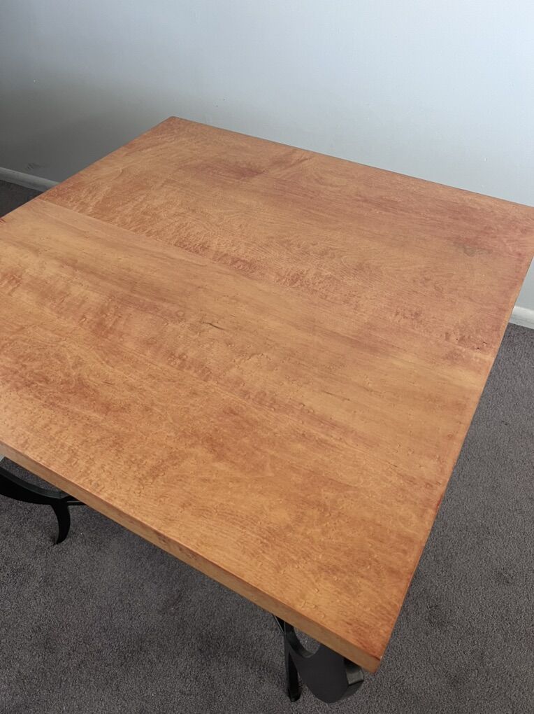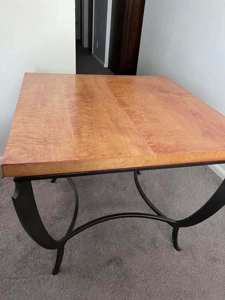 VenmoSolid wood table with custom top and decorative metal base. Heavy, sturdy, and well made. Natural wood grain with minor character marks. Its dimensions are 29.25” x 29.25” and it’s 24.5” tall. Text me if you have any questions