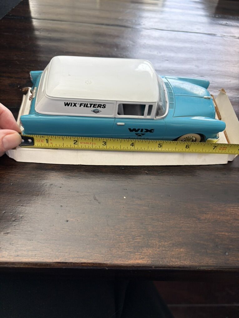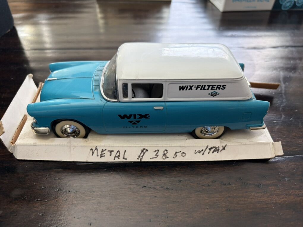 Classic vintage-style WIX Filters promotional diecast car. Has a retro turquoise and white delivery-wagon design with original WIX branding on both sides and roof panel.\