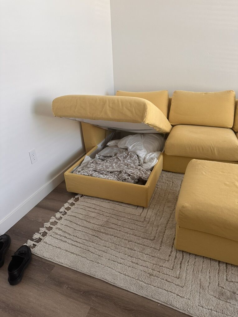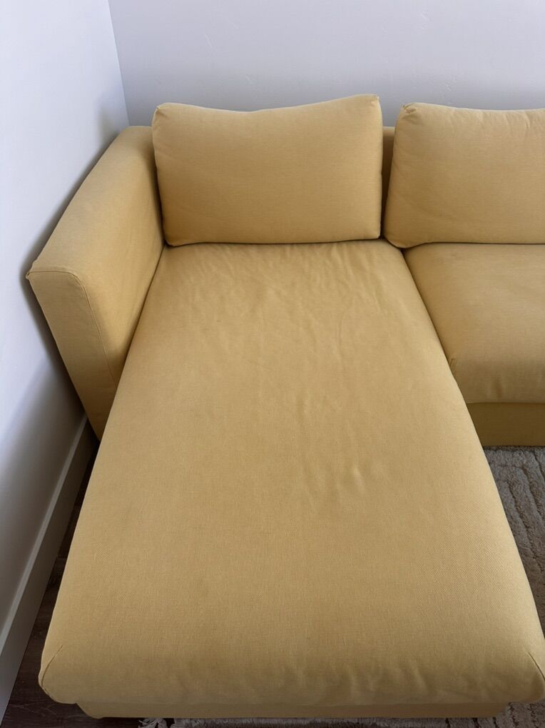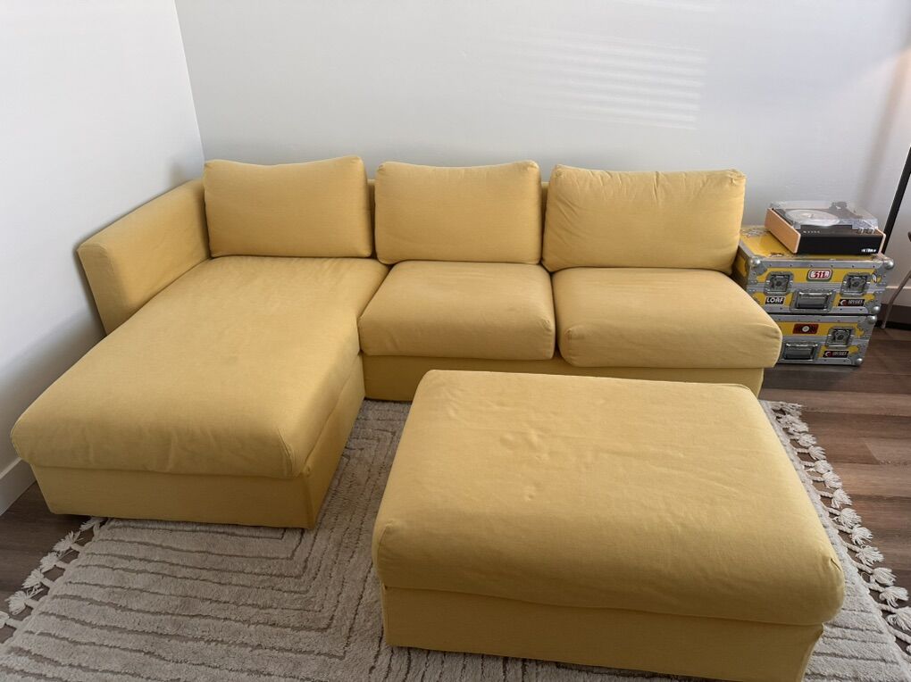 ApplePayYellow Ikea Couch with Ottoman! The covers are washable and you can get new ones online if you don’t like the yellow. It’s surprisingly very comfortable but I am moving and don’t need it anymore! There is a small rip in the back cover near the bottom that isn’t visible- and the couch has recently been cleaned. There are a few small stains but otherwise in really great condition.