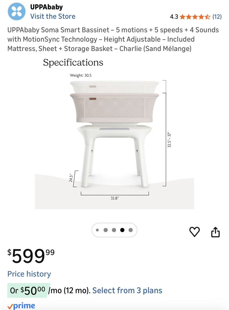 ApplePay4Moms MamaRoo Bassinet original price $419. Similar product now $599 because 4Moms was bought out by Uppa Baby. My baby never directly slept on the mattress pad. Always in a dock a tot inside the bassinet. Plastic film still on the screen. Comes with waterproof mattress protector and storage basket as shown.