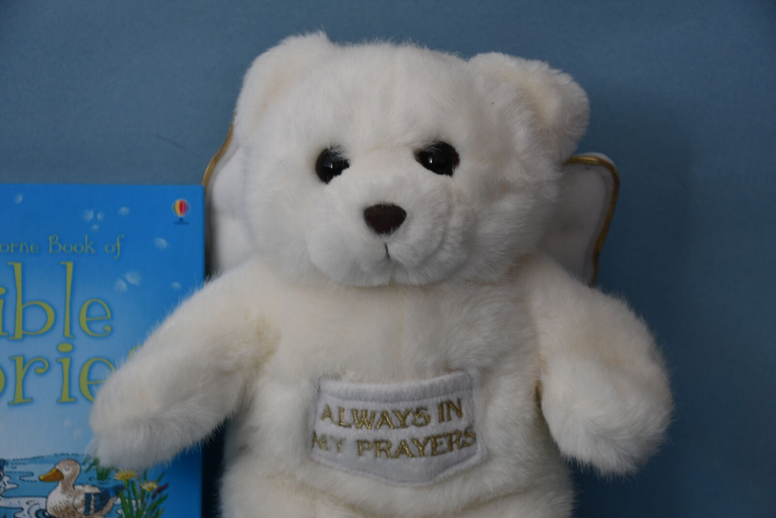 This Set of a 11" "ALWAYS IN MY PRAYERS" WHITE ANGEL TEDDY BEAR & a CHILDREN'S BIBLE STORIES BOOK with CD is from a smoke free home. Questions??? Please ask. We are located in Plain City. Cash only please.