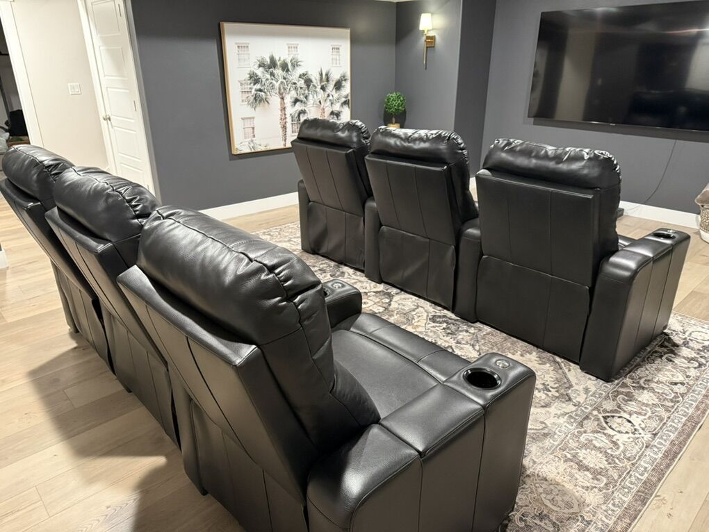 VenmoThese theater chairs have been perfect in our basement, we just need a different setup to fit more people. They are in excellent condition and are made very well. Selling all 6 chairs together. Measurements of each row below. They are a manual recliner not electric so no cords.