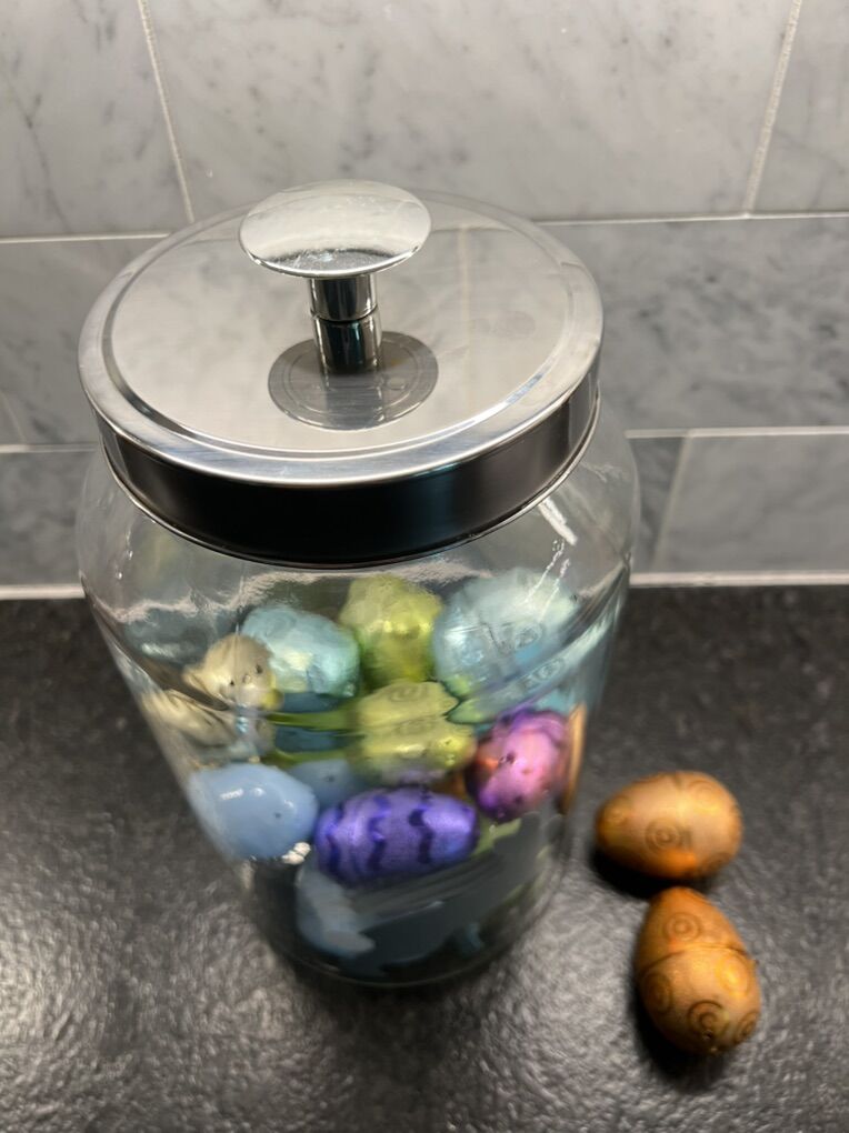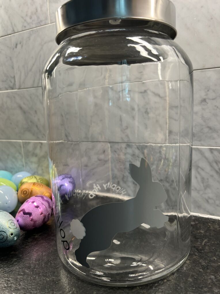 VenmoClear glass jar featuring a charming hippity hop design with a gray bunny decal. Includes a metal lid with knob handle. Approximately 10 inches tall. Clean modern look-perfect for seasonal decor, candy, treats, or countertop storage. Details: • Clear glass jar. • Approximately 10 inches tall. • Metal lid included. • Gray bunny, silhouette decal with “Hippity Hop” text. • Great for Easter decor, spring displays, or storage. • Gently used, great condition • Plastic eggs included