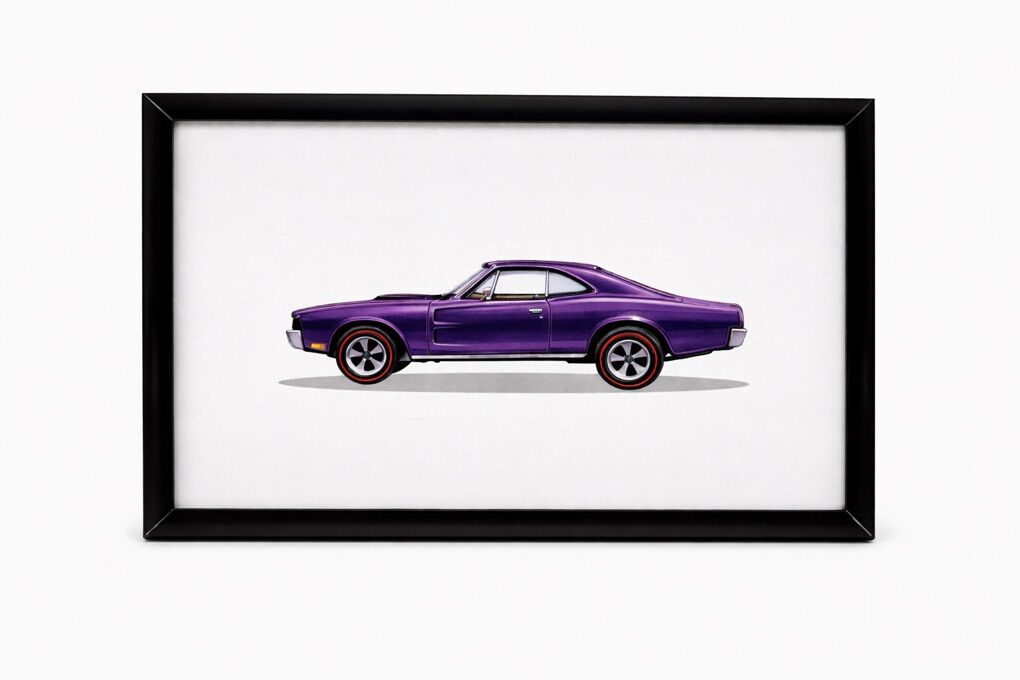 Jimmy’s toy box creations bring you 11x16 framed canvas prints inspired by classic 1960s and 70s Redline Hot Wheels cars—bold colors and iconic redline wheels.