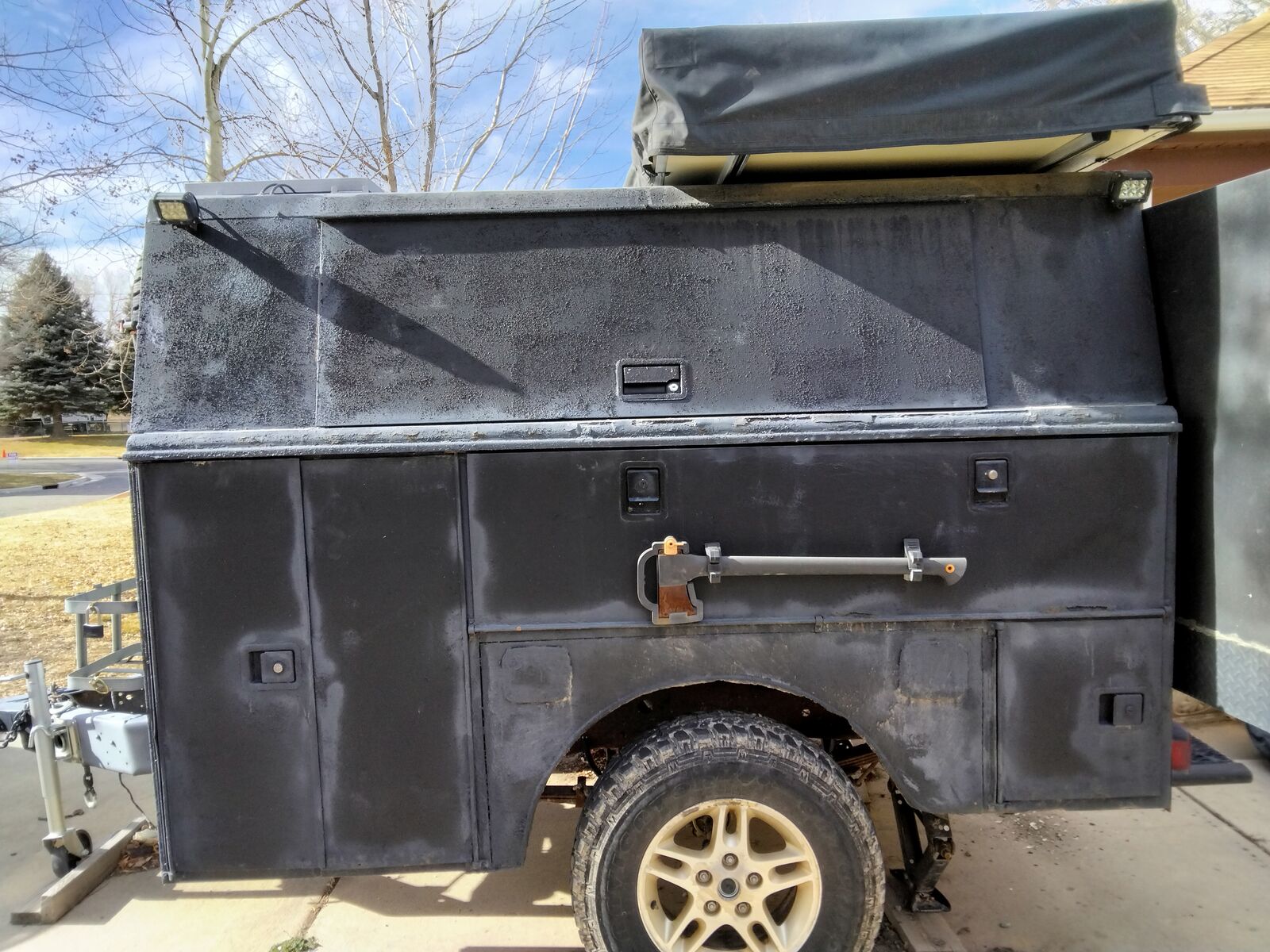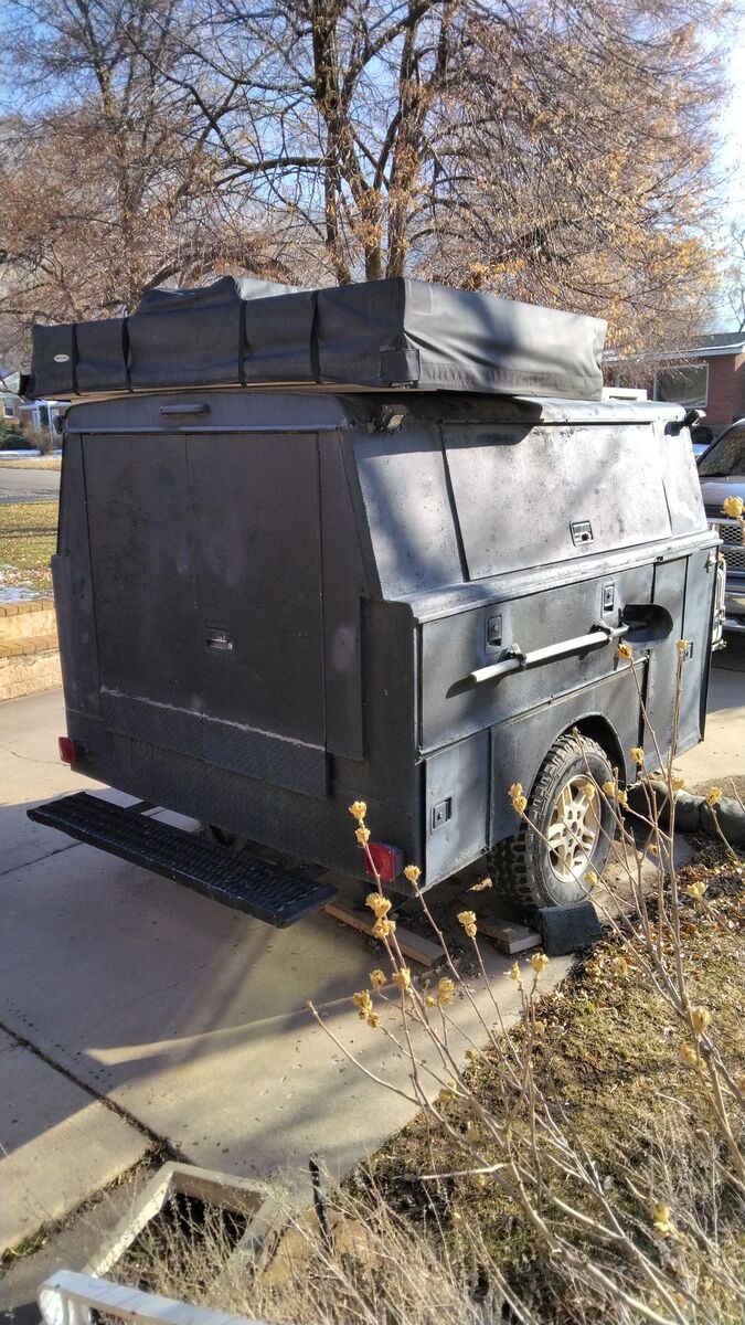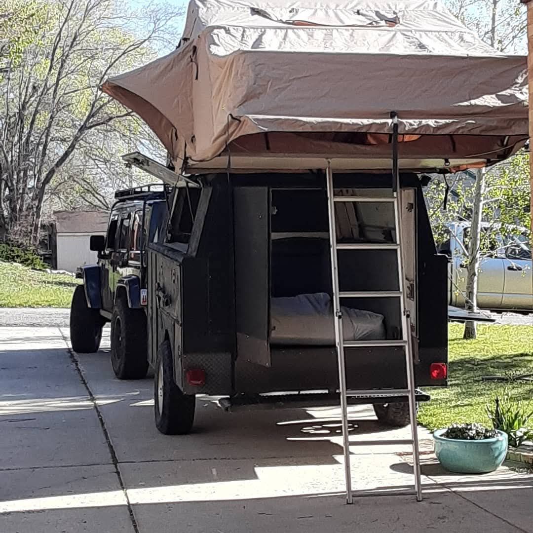 Off grid camper trailer has a king sized roof top tent with awning. Solar panel. TV. Propane tank and extra gas tank. Spare tire.