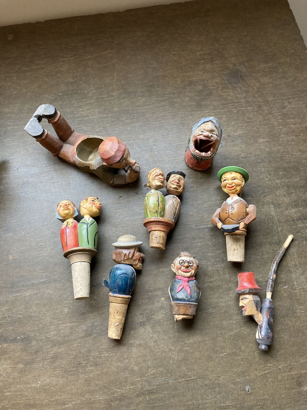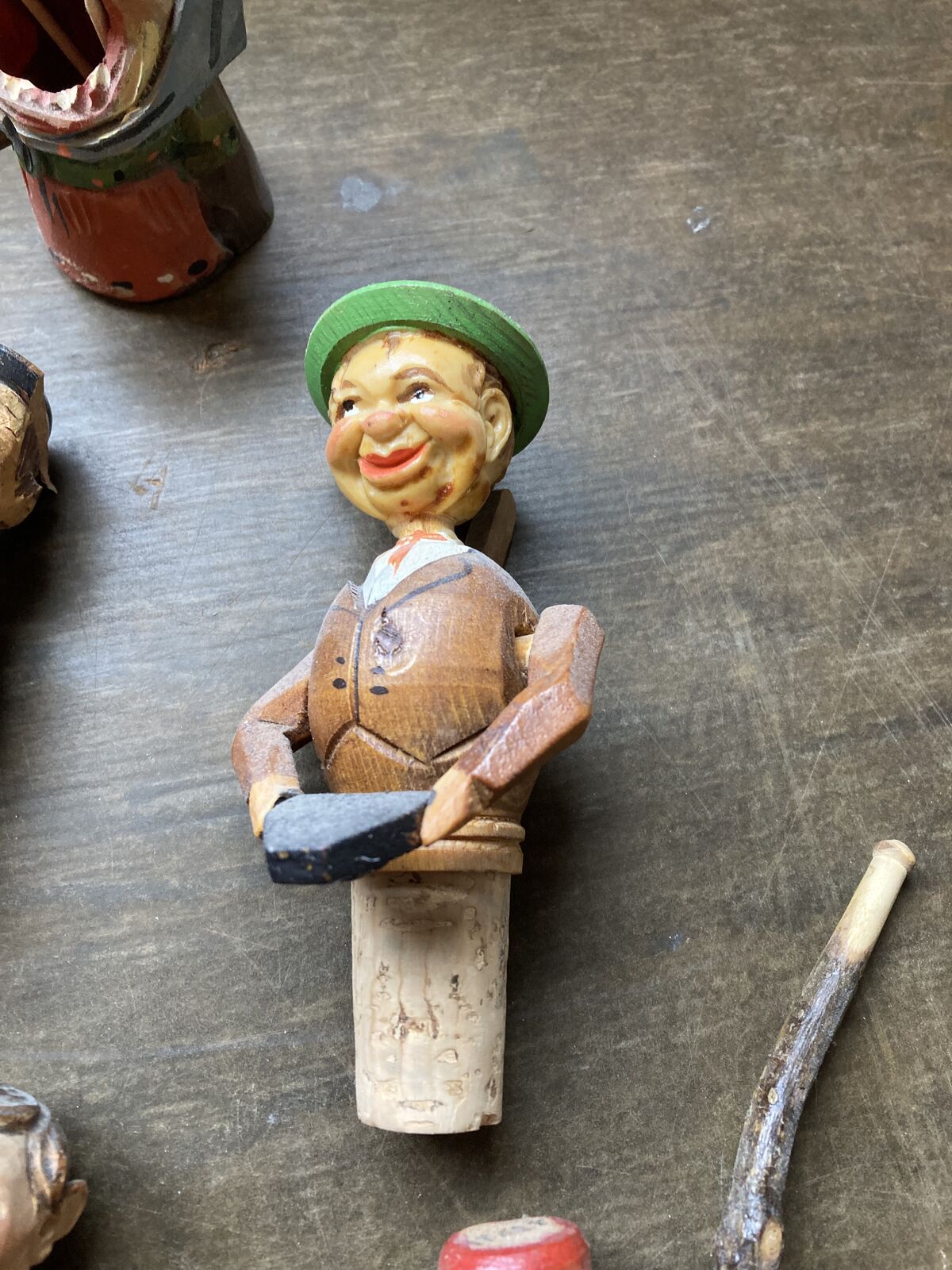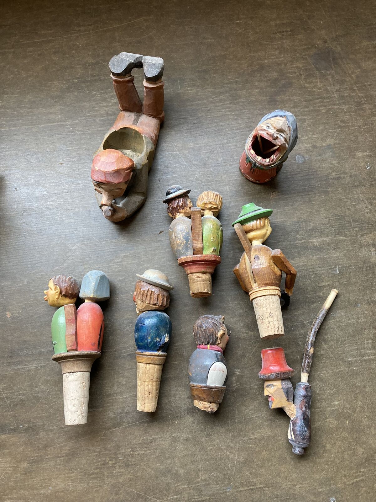 Antique and Vintage wine bottle stoppers and small wood carvings. All shown for $150 dollars.
