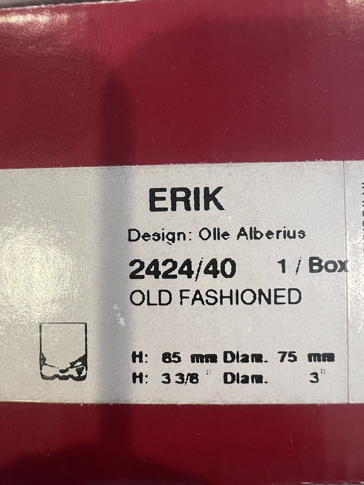 I have a set of six Oreefors “Erik” old fashioned glasses. Brand new in boxes. Boxes show a small amount of wear as shown in pictures. Received as a gift but they aren’t needed.