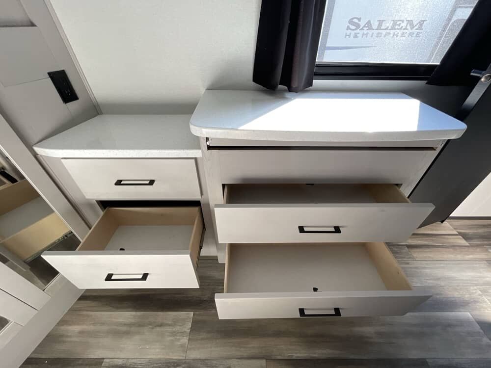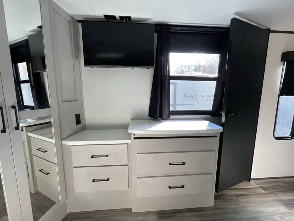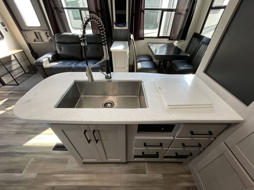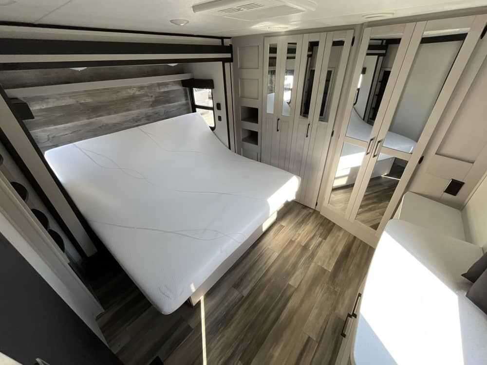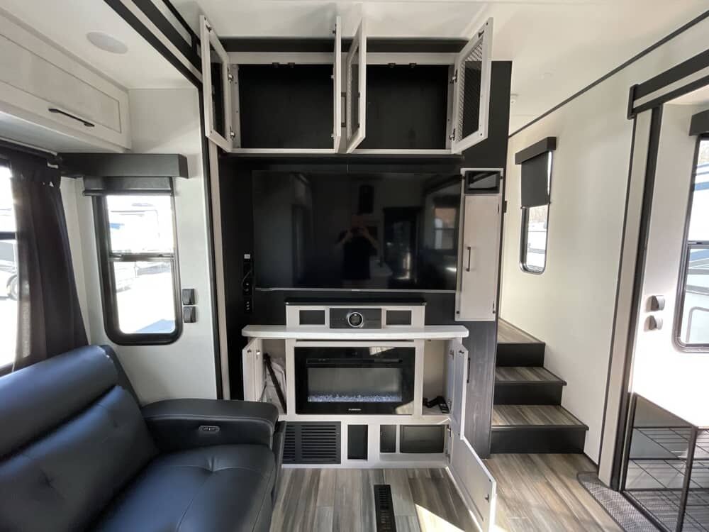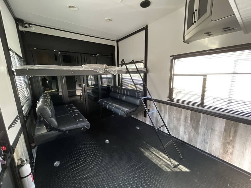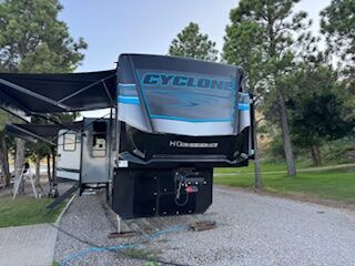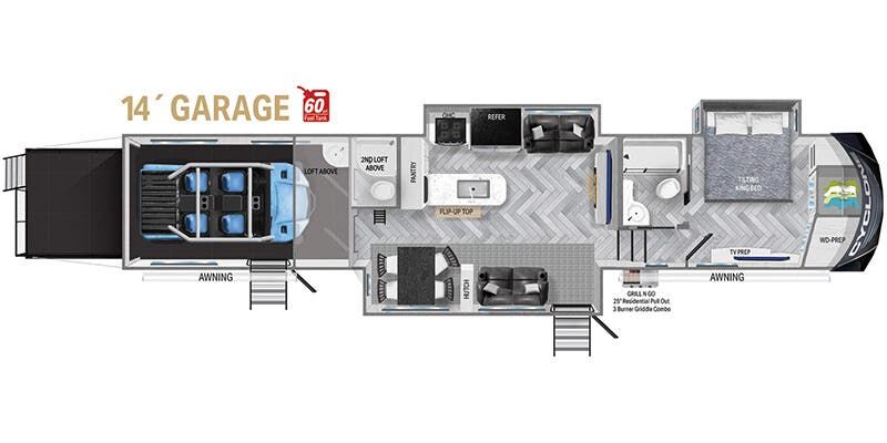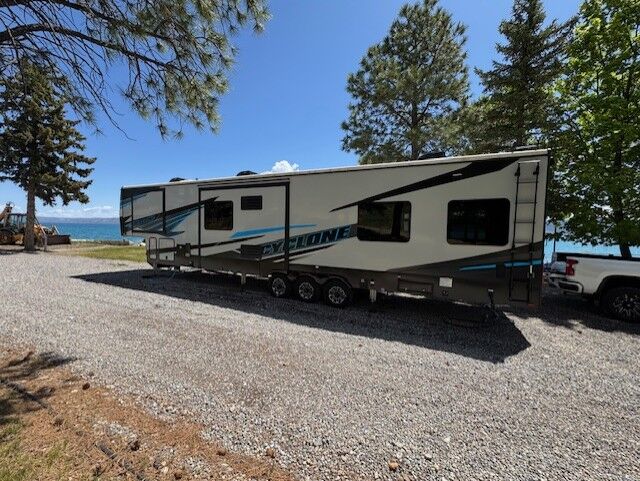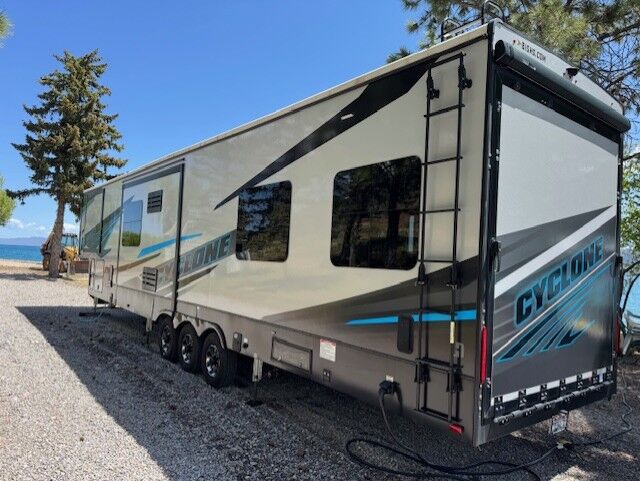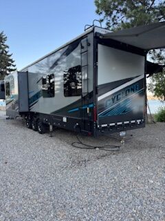 The Cyclone 4014C is a premium fifth wheel toy hauler designed for comfort, family use, and adventure. It features a front king bedroom, mid bunk, mid kitchen and living area, two full baths, and a spacious garage.