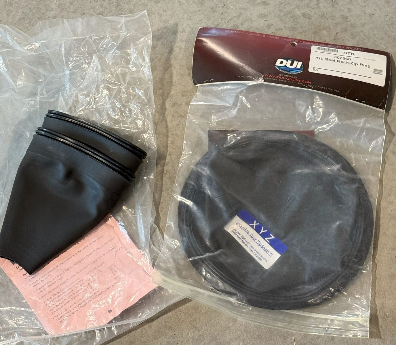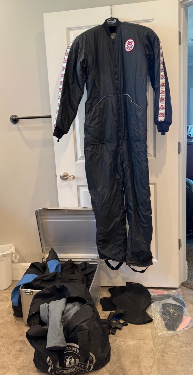 The item includes the following, as pictured: DUI TSL dry suit, lightweight underwear, heavy underwear, two bags, an Aluminum case used for the dry suit, one neck and wrist seal, two hoods, and two sets of foot straps to keep air out of the feet.