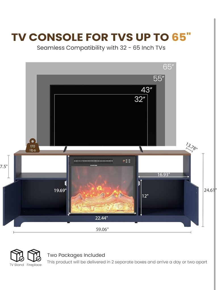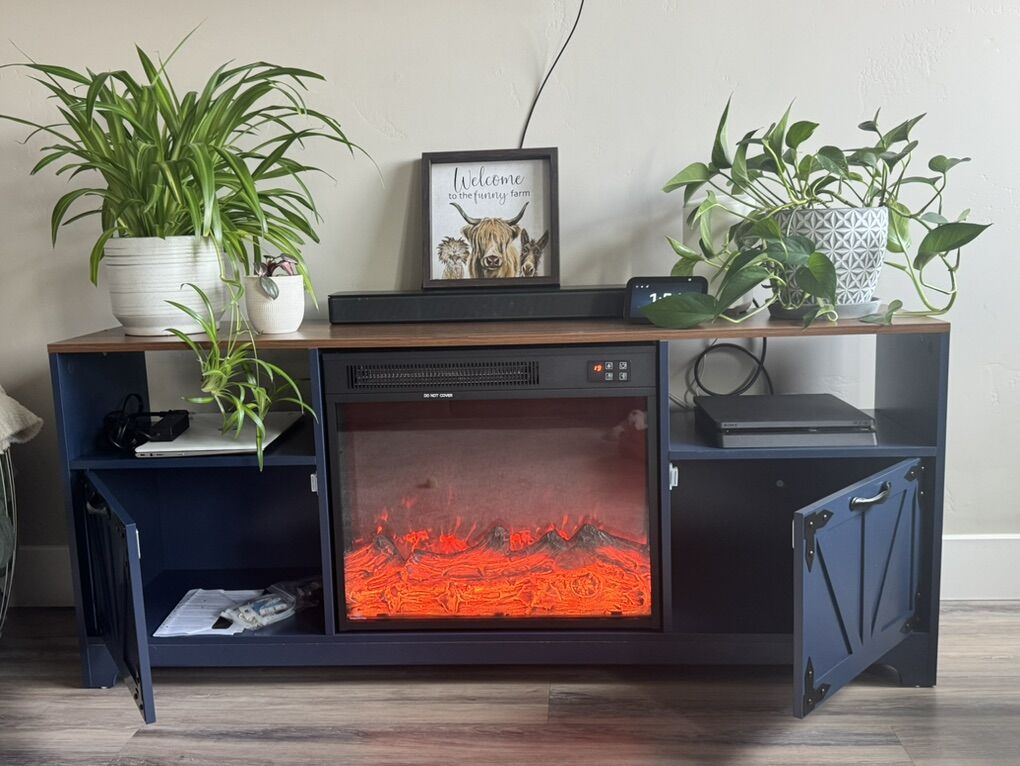 ApplePayBeautiful blue, farmhouse style tv stand with electric fireplace. The fireplace has multiple settings and heats the room very well. There is also and LED light kit. I didn’t install it, but I kept the kit and it will be easy to install if you choose.