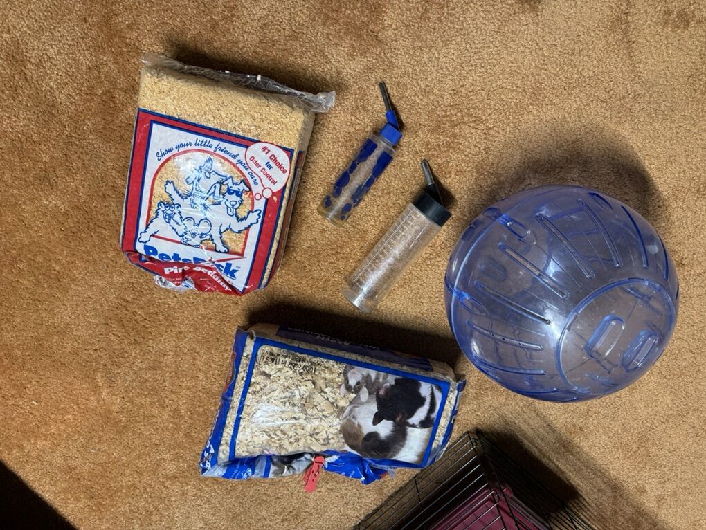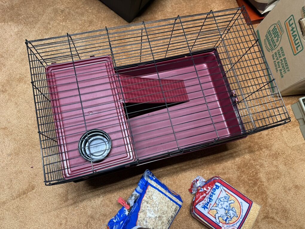 VenmoLike New Small Animal Cage, plus 2 bags of wood shavings, 2 water drip feeders, upper platform with ramp, rolling ball, food bowl and the cage is on wheels. It measures 29 1/2” long, 17” high, 17” wide.
