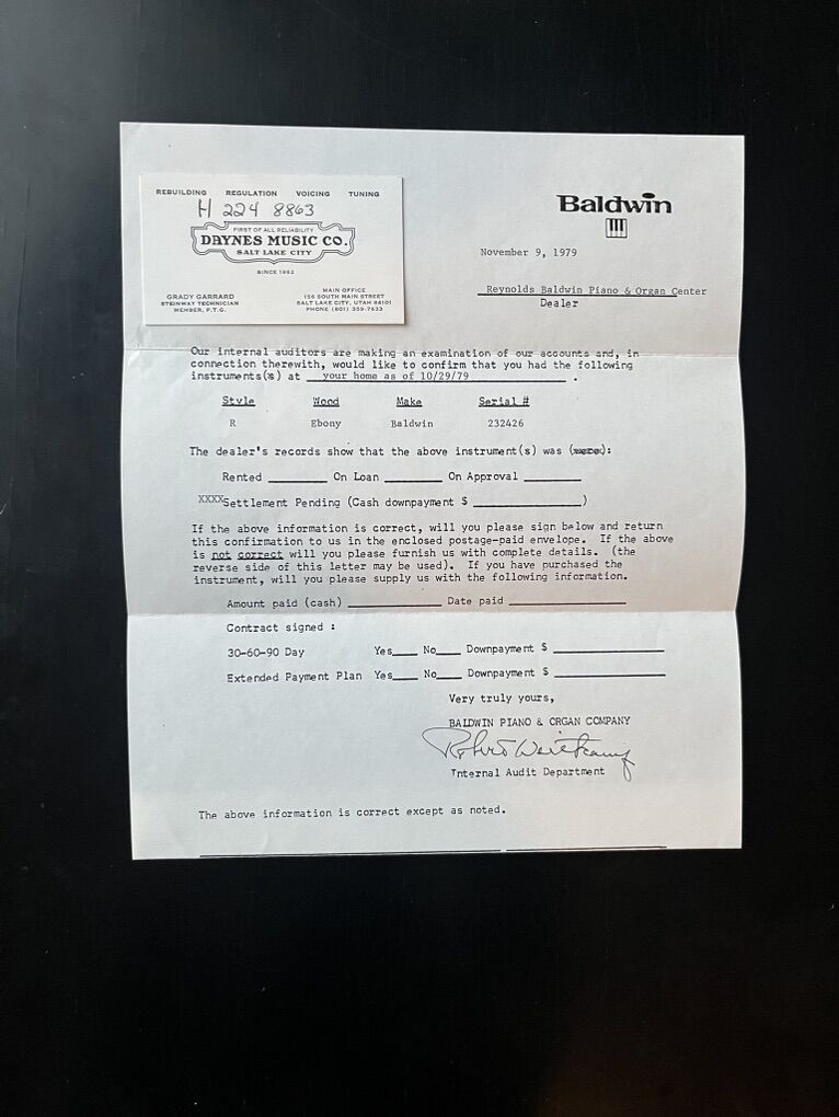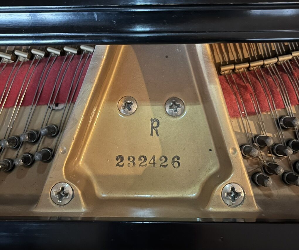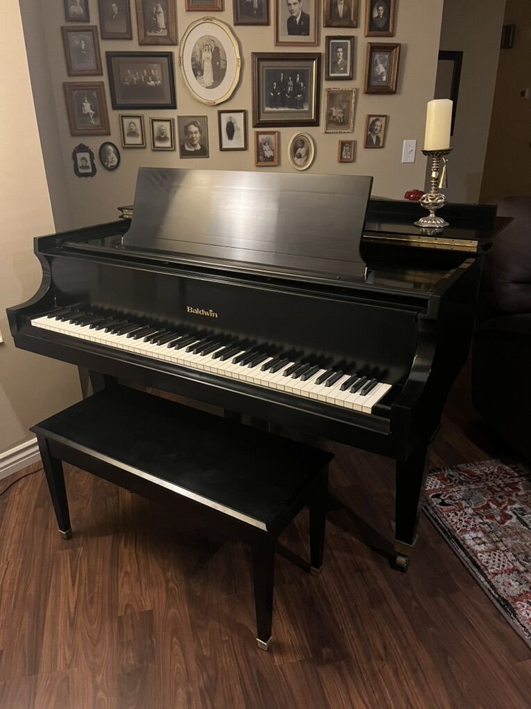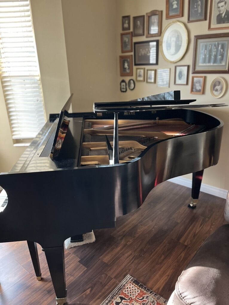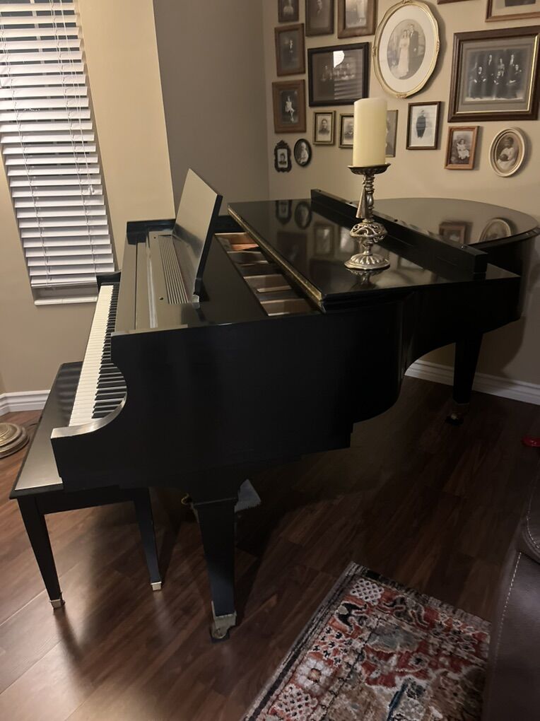 Beautiful, polished ebony baby grand piano in great condition. Includes bench. Smoke free home. Model R232426 Length 5’ Width 5’ 2” Very nice tone.