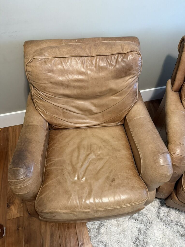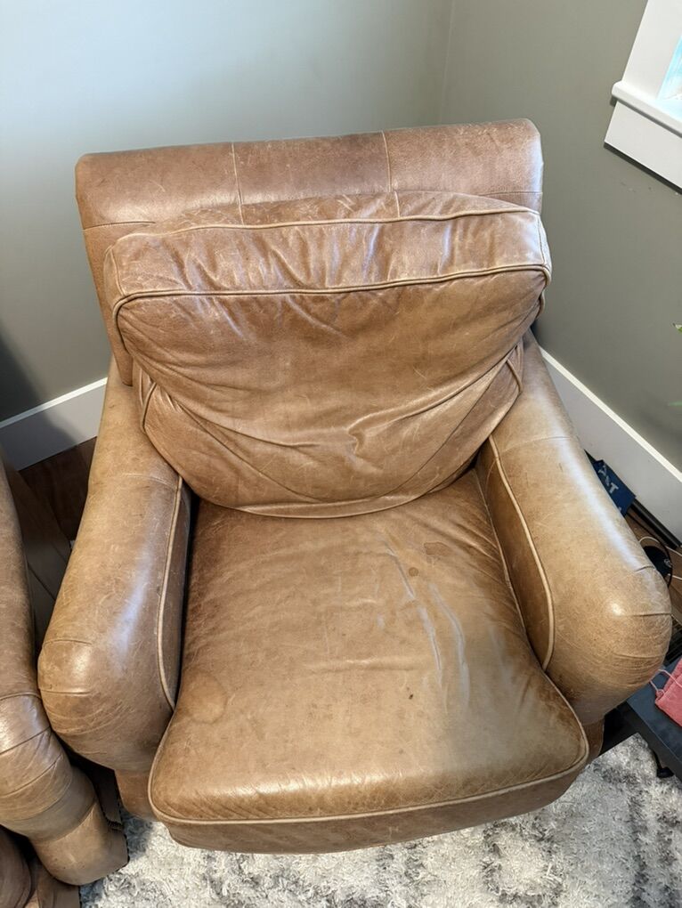 PayPalGot a couple of leather chairs that need a new home. These high quality chairs are very comfortable. They have avarage wear and patina as shown in the pics. A little oil staining on the arm rests and some other water marks and such from normal use. Price is $125 each or $175 for the pair.