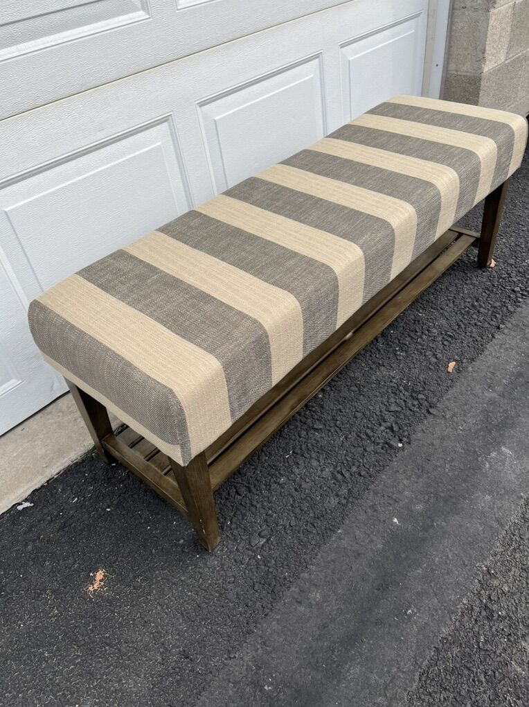 This bench is like new. Beautiful soft stripes, perfect for entryway, bedroom or mud room. Measures 47x 15, 18 tall. Pickup in River Heights, cash preferred.