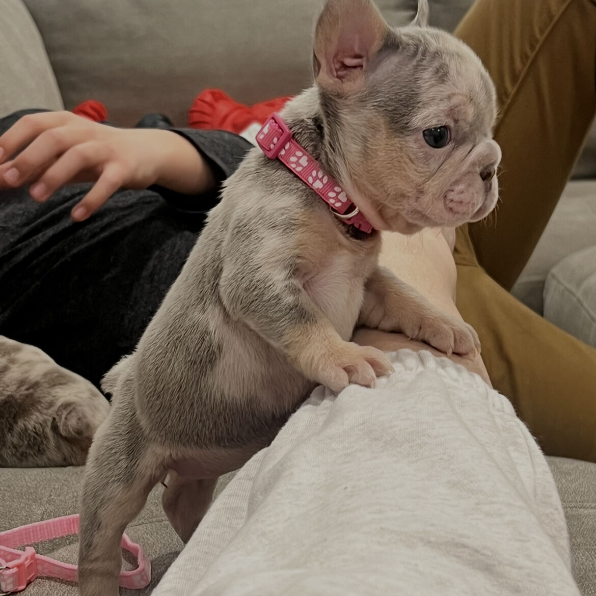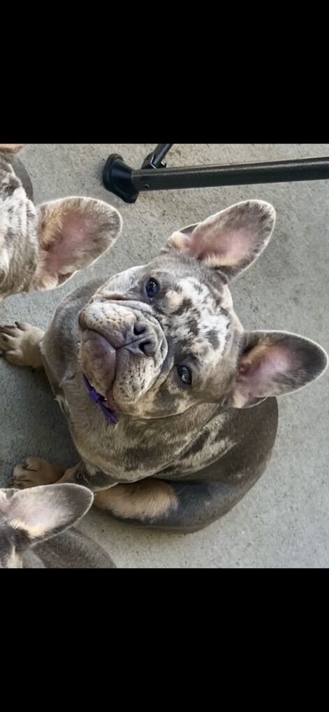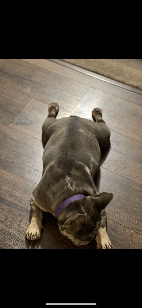 6 week old frenchie babies Born 12/18/25 Perfect Valentines gift!!! Mom is a blue and tan Merle (pictured) Dad is a solid blue covered in cream big rope (pictured) Both parents genetics are Co/co B/b AKC registered Will come with first set of vaccines Breeding rights available for extra fee Price varies by puppy Able to hold with deposit