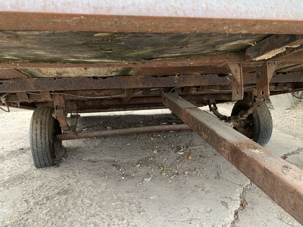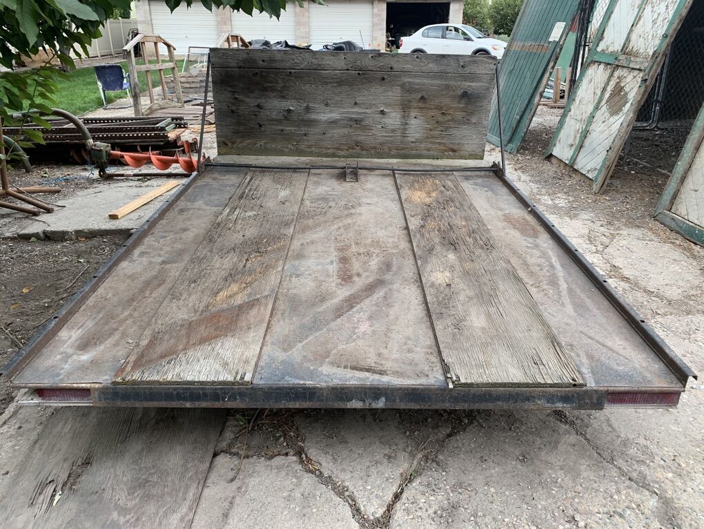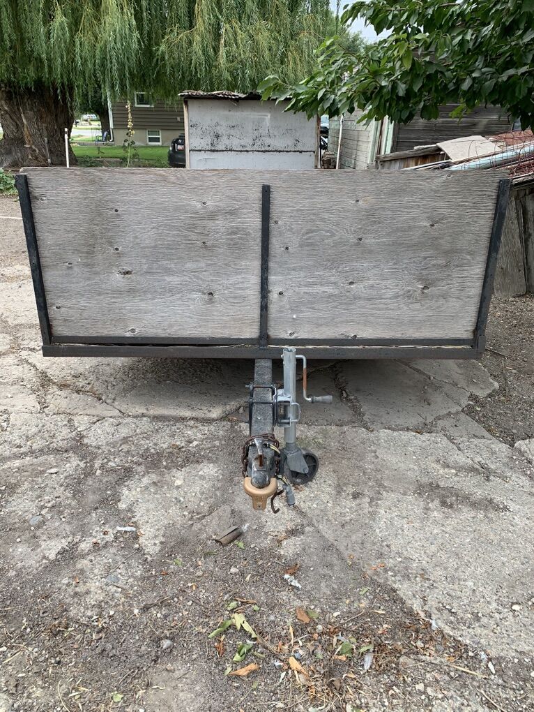 VenmoMetal/wood tilt snowmobile trailer with splash guard. 6’6” W x 8’9” L. Overall width and length is 6’9” W x 12’1”. Takes 1 7/8” ball. Will want to consider replacing tires, pack bearings and do some electrical work. There is some deterioration on the underside which will want to be addressed as well. Was used as a snowmobile trailer but could be converted to transport an ATV or modified to be used in a landscape business. Year unknown but roughly 1970’s.