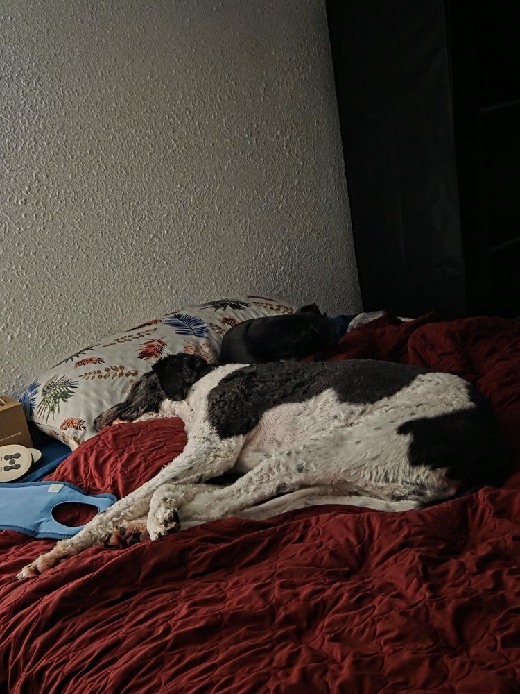 He doesn't realize how big he is he loves laying on you next to you or under foot. He self-sooths from overstimulation by picking up a toy and if able he will try and make a few circles through your legs. He loves cats and just wants to play however he needs a safe introduction period to learn to be gentle as he forgets how big he is.