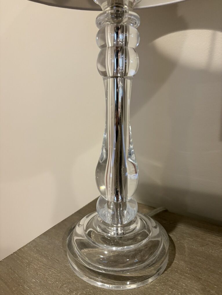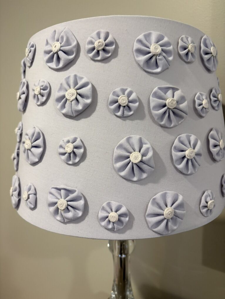 VenmoPB Kids lamp. Shade is lavender. Measures 20.5” high and is 12” wide at the widest point (bottom of shade).