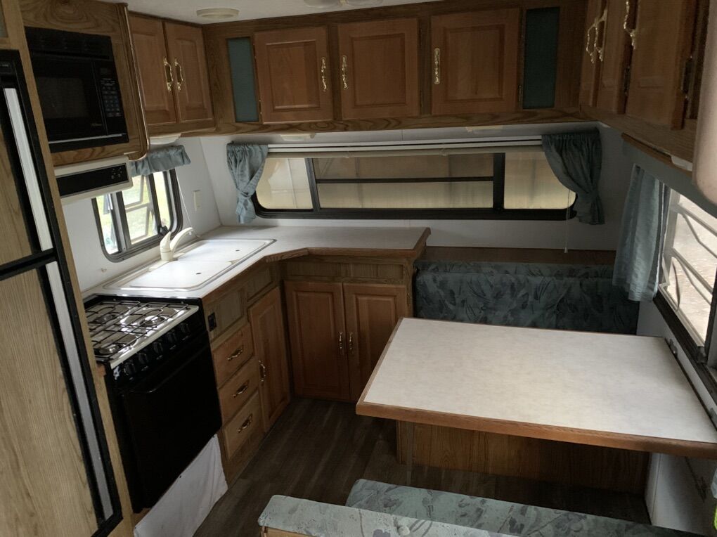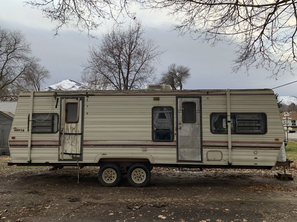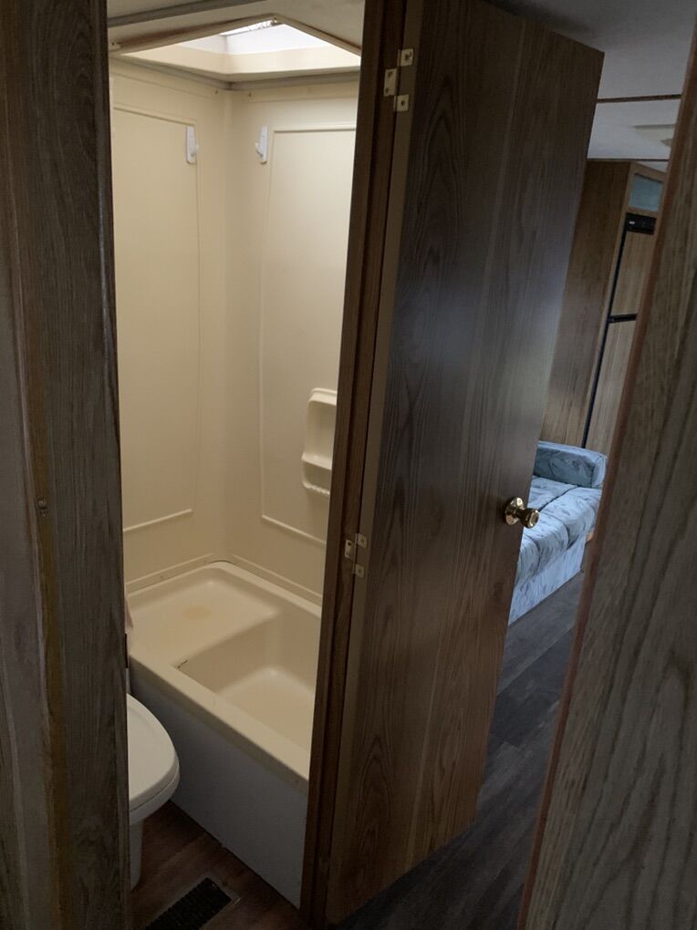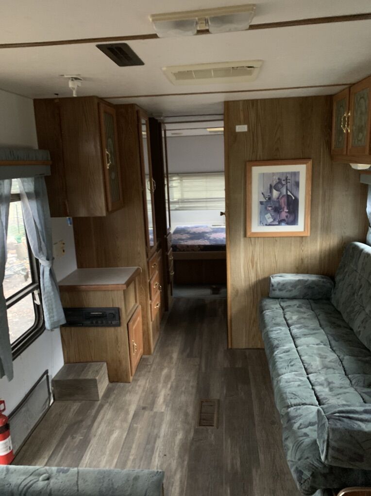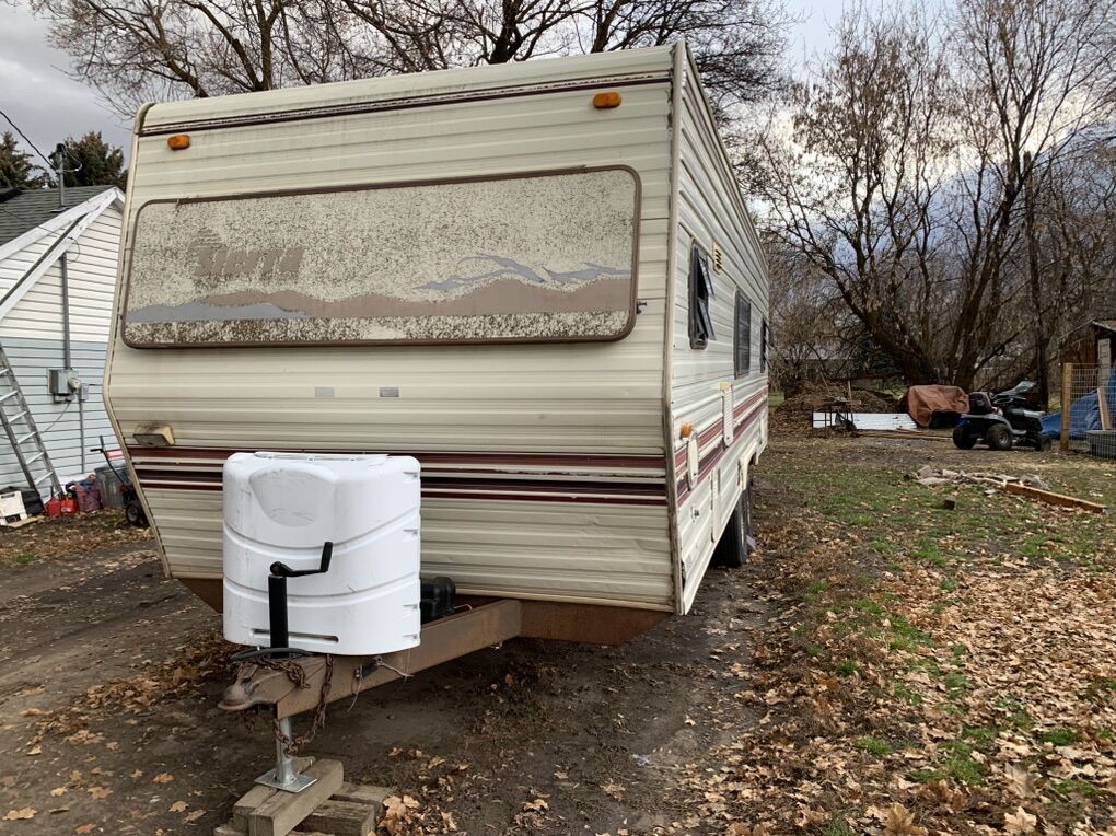 This camp trailer is a little older but still has a lot of life left. The fridge works on gas and electricity. The stove and oven both work. The heater, water pump, and hot water heater work as well. We have winter camped in this camper during the winter without issues. As far as I can tell there are no leaks in the water lines or electrical problems. The two exterior doors need to be re-skinned which I was quoted $100-$150 each, or with a little YouTube university I’m sure it could be done the DIY method. The blinds for the windows are a little aged but still cover the windows and operate with out issue.