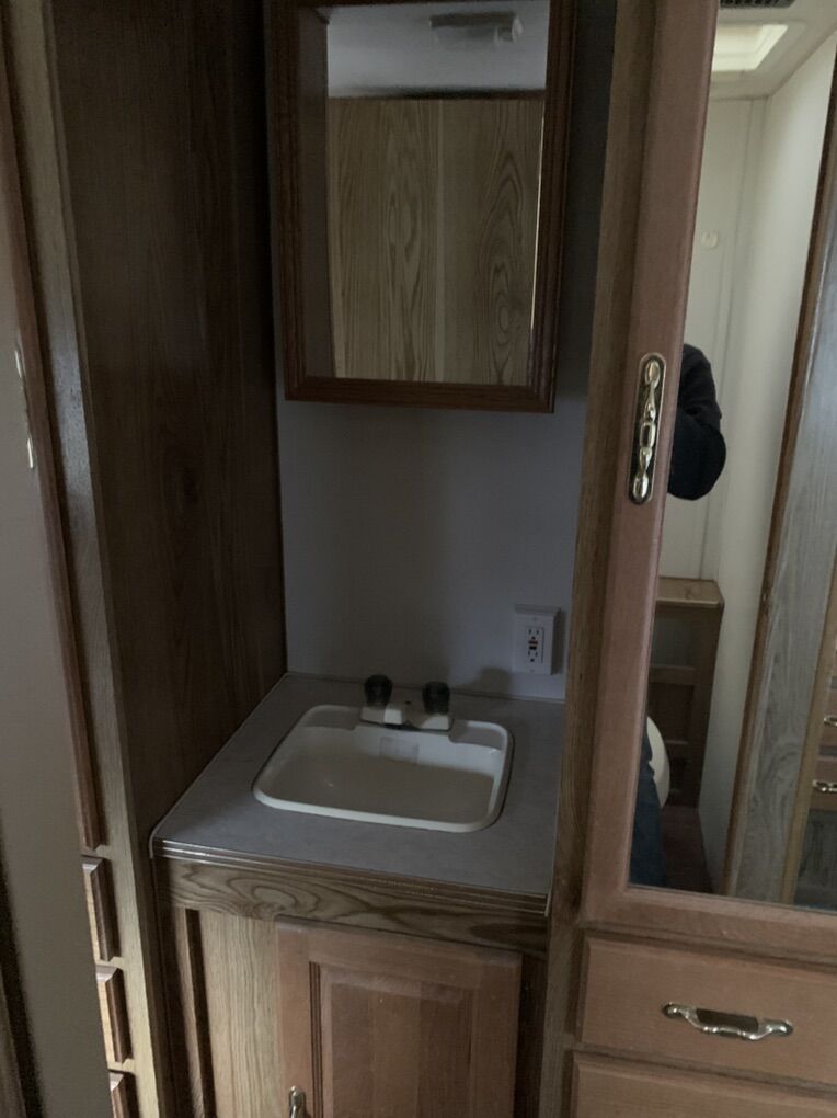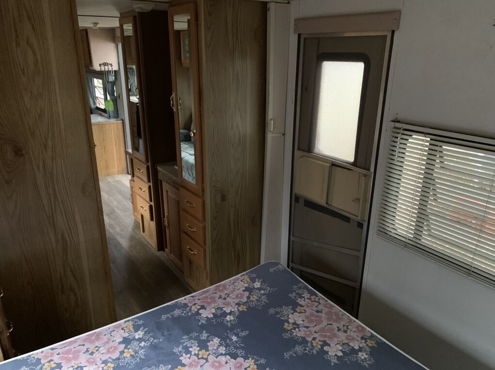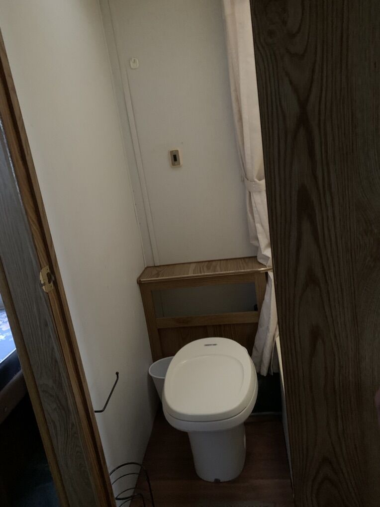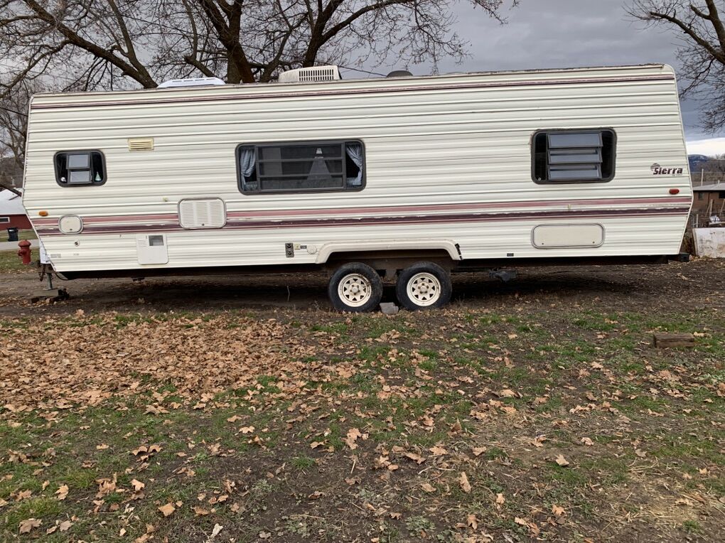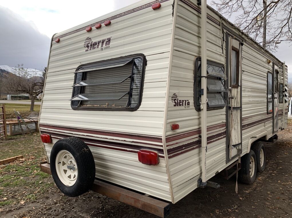 This camp trailer is a little older but still has a lot of life left. The fridge works on gas and electricity. The stove and oven both work. The heater, water pump, and hot water heater work as well. We have winter camped in this camper during the winter without issues. As far as I can tell there are no leaks in the water lines or electrical problems. The two exterior doors need to be re-skinned which I was quoted $100-$150 each, or with a little YouTube university I’m sure it could be done the DIY method. The blinds for the windows are a little aged but still cover the windows and operate with out issue.