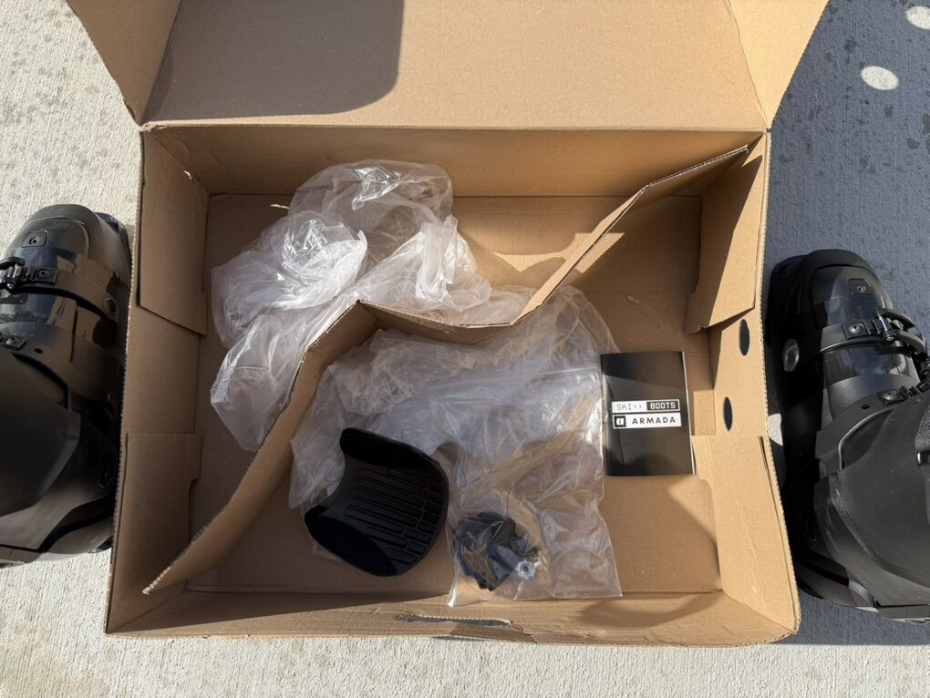 They were only skied once (one long day), so there are some light cosmetic scratches, but nothing structural (see photos for details, what you see is exactly what you get). Other than that, they’re in excellent condition. The liner is in perfect shape, hardly packed out. I’ll include the original box, tags, inserts, and all original accessories that came in the box.