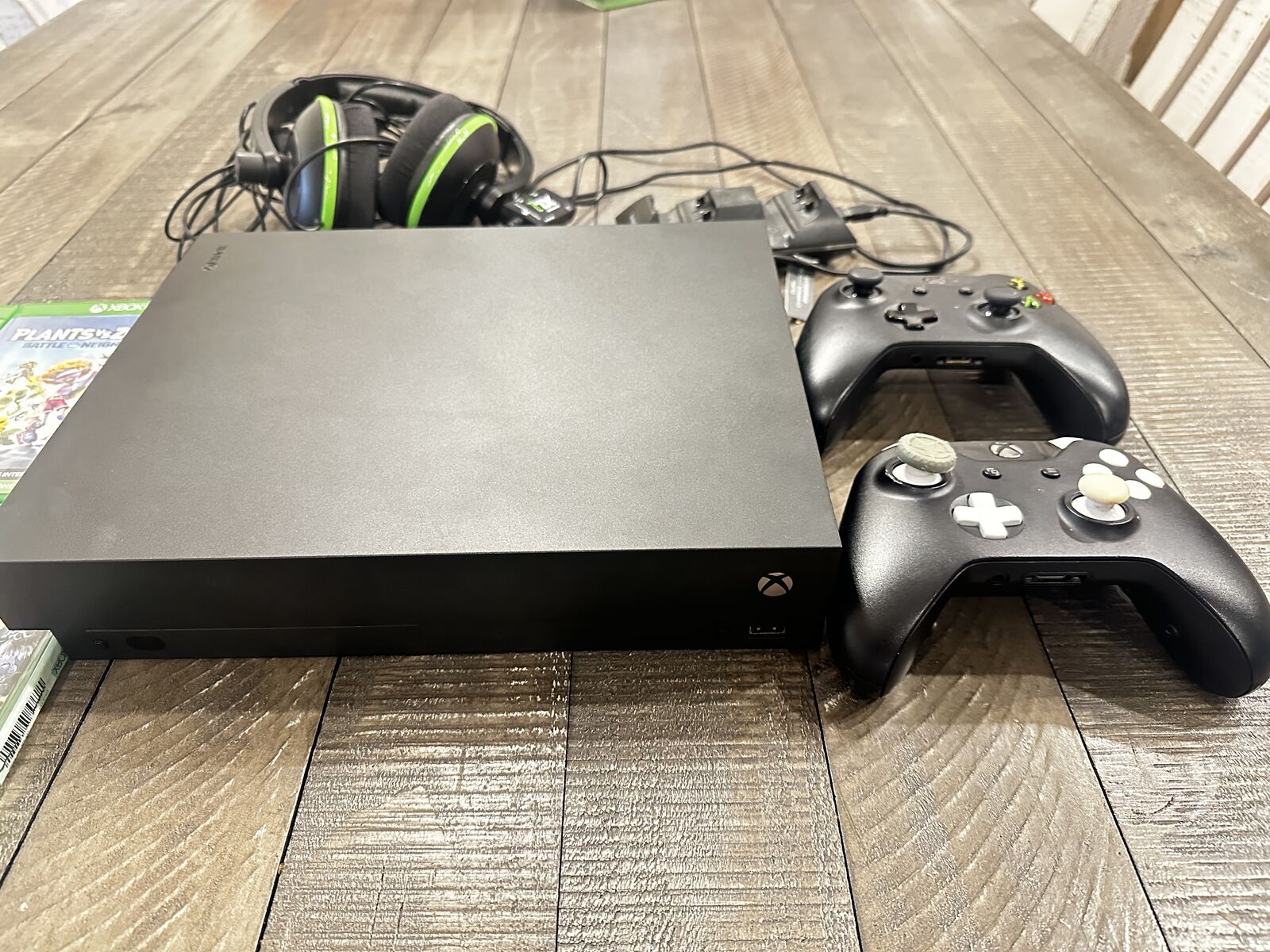 ApplePayWe are selling our Xbox One X. It has been lightly used. Comes with six games, two controllers, a head set, re chargeable batteries for the controllers, the original box, and the power and HDMI cable.